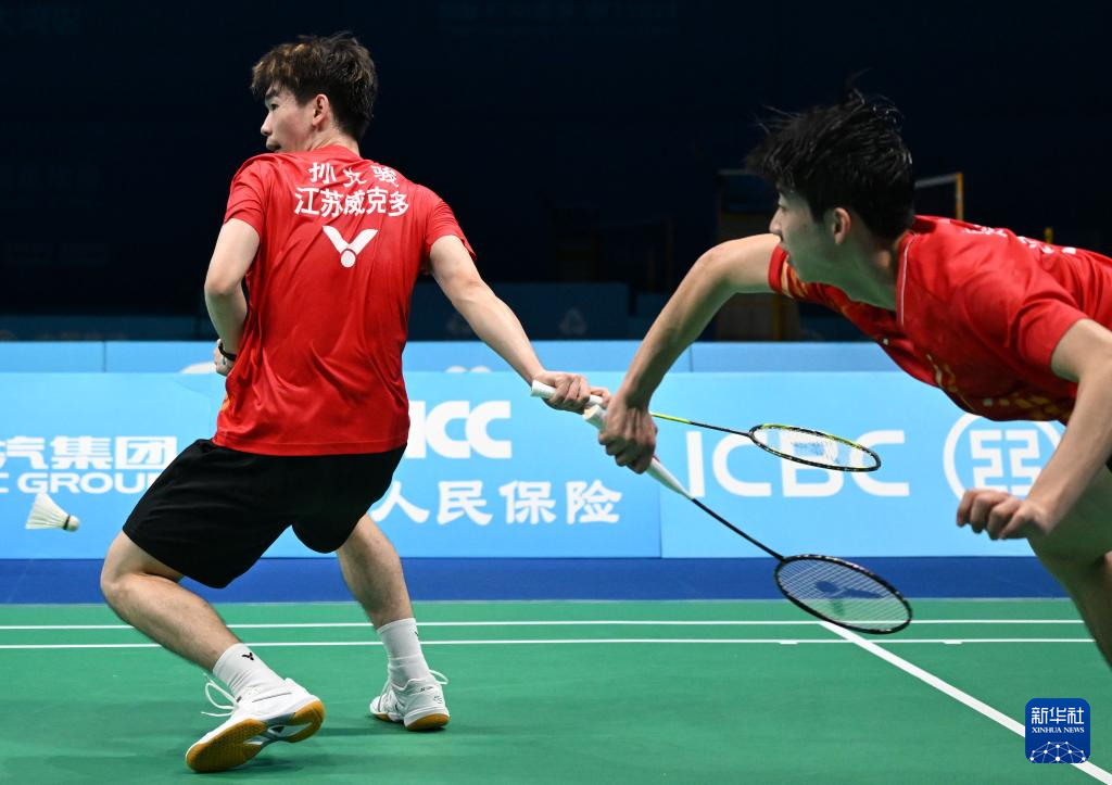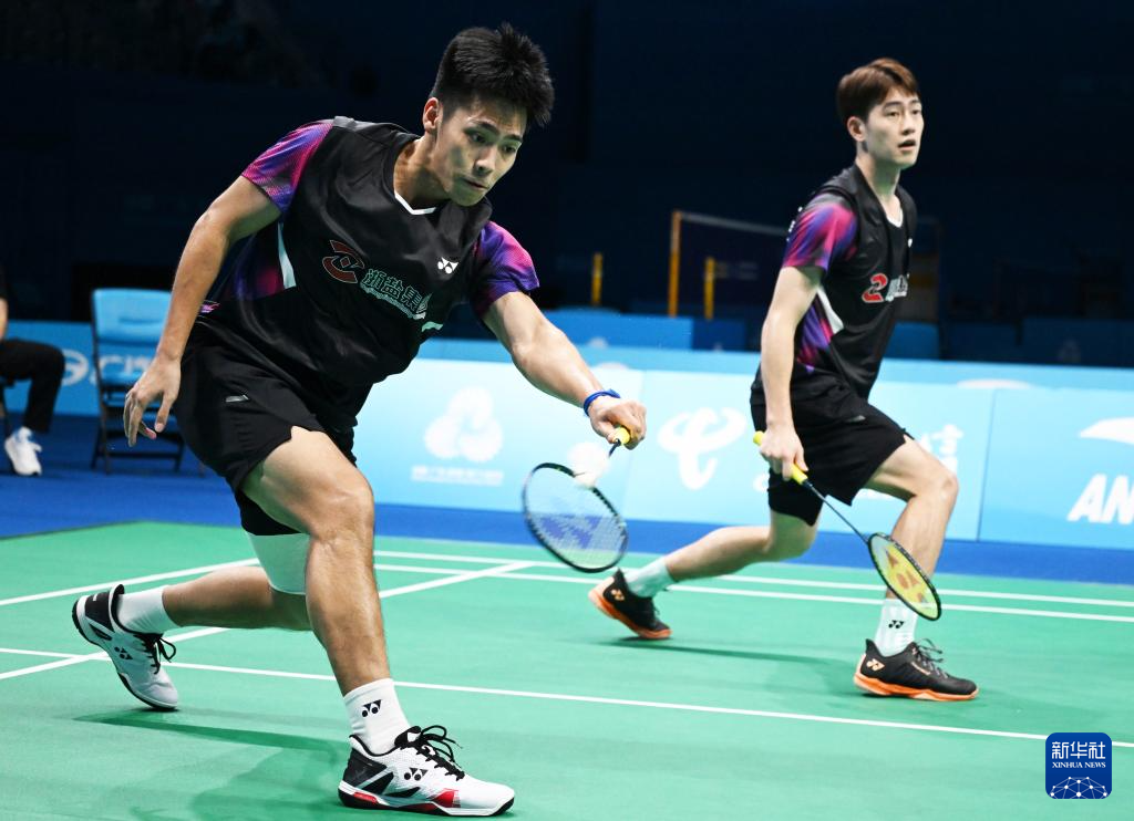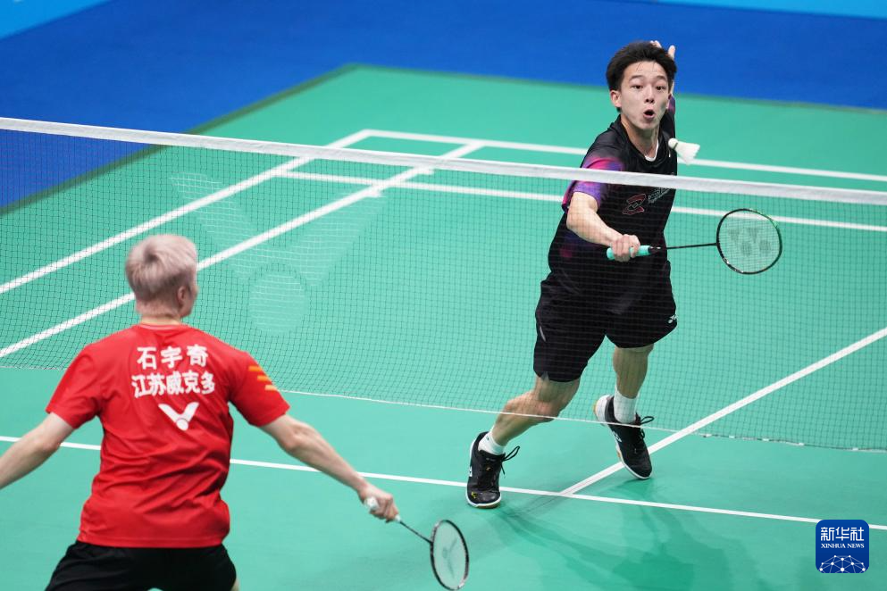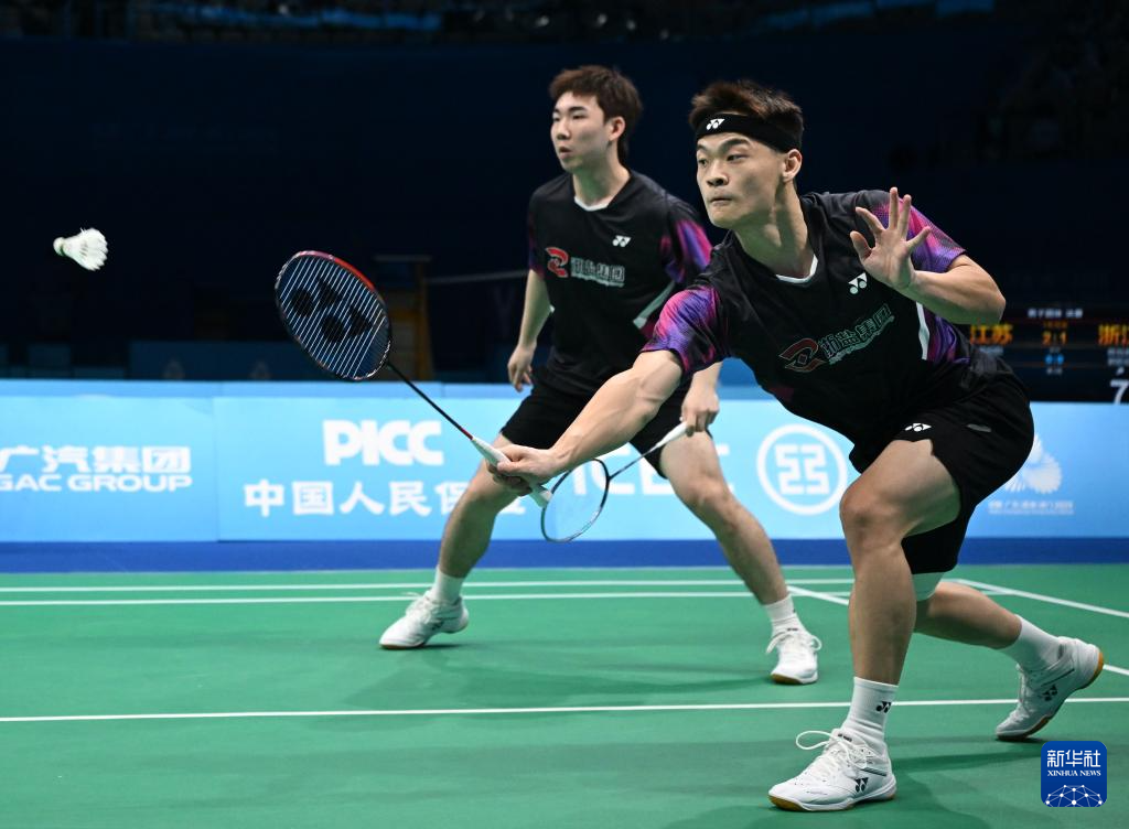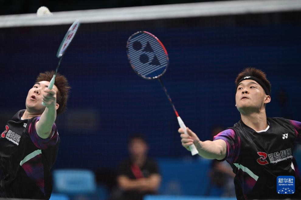11月14日,浙江队组合王昶/谢浩南(左)在男双比赛中。最终,他们2比0战胜江苏队组合孙文骏/朱彦澎。
