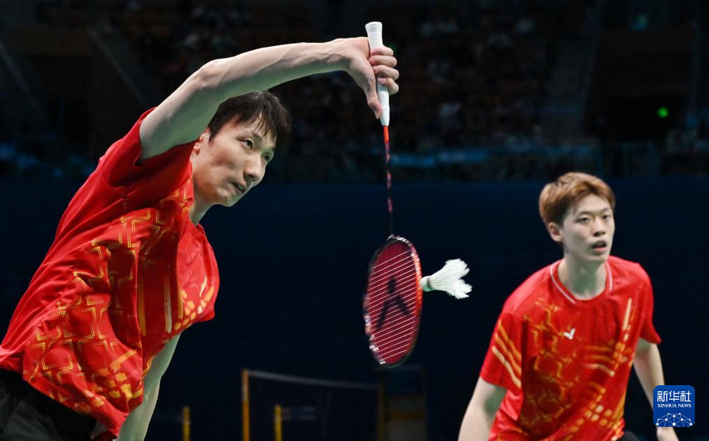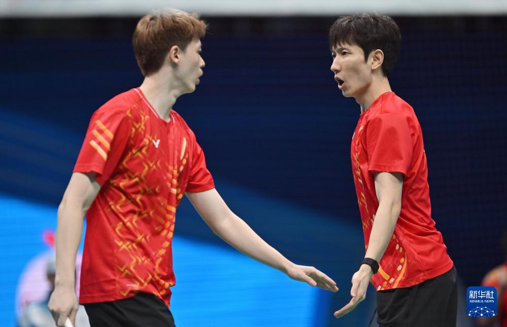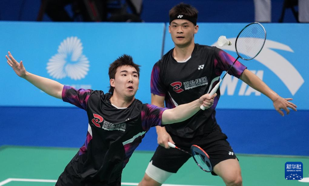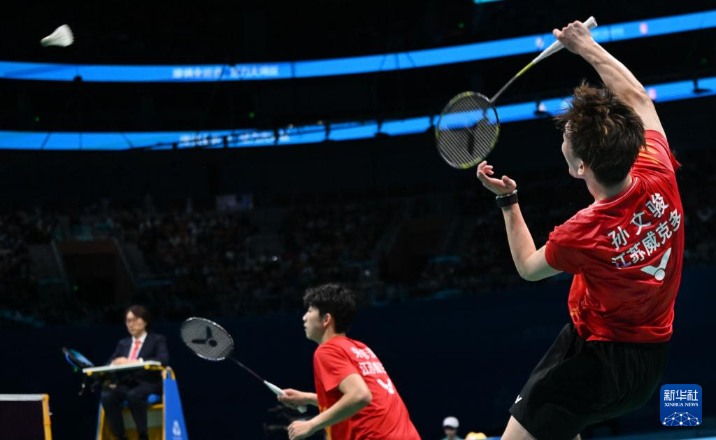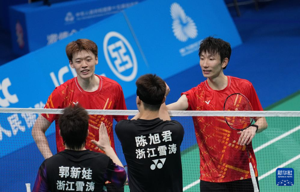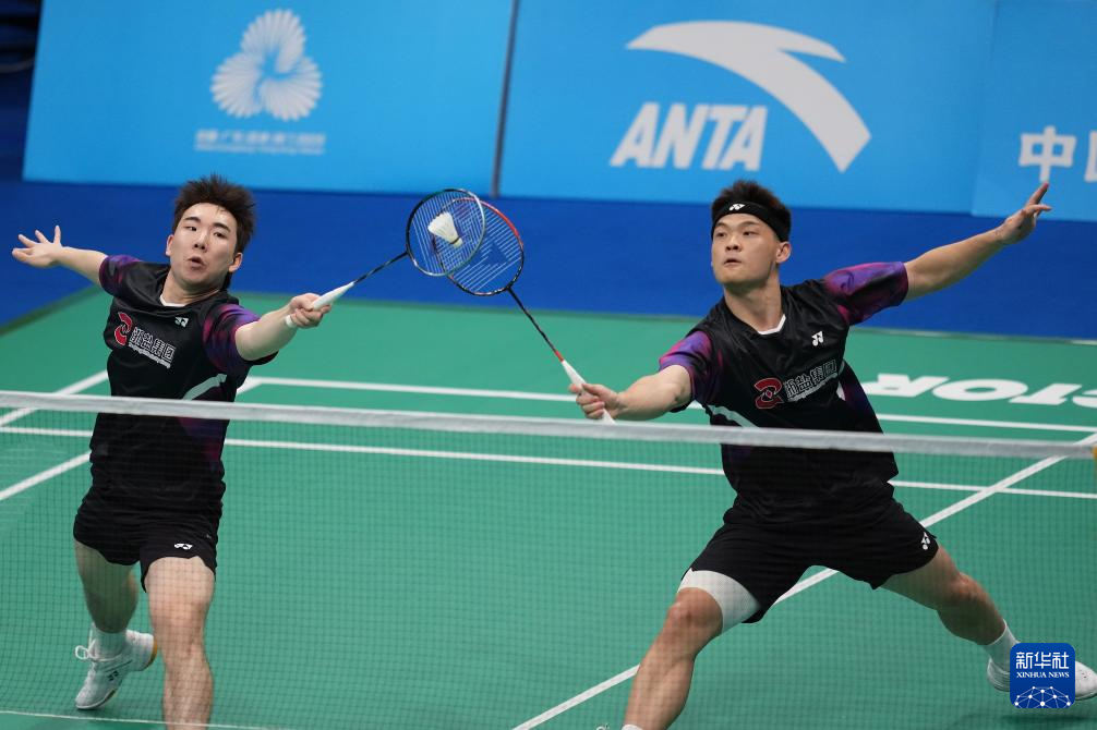 11月14日,浙江队组合王昶/谢浩南(左)在男双比赛中。最终,他们2比0战胜江苏队组合孙文骏/朱彦澎。