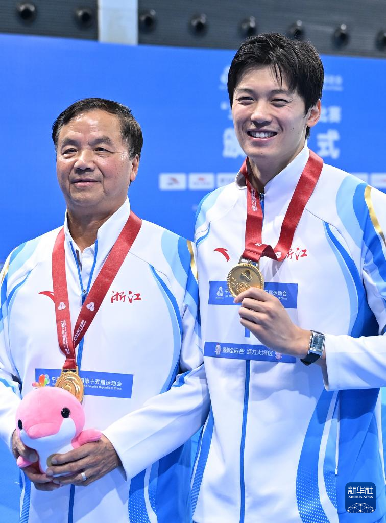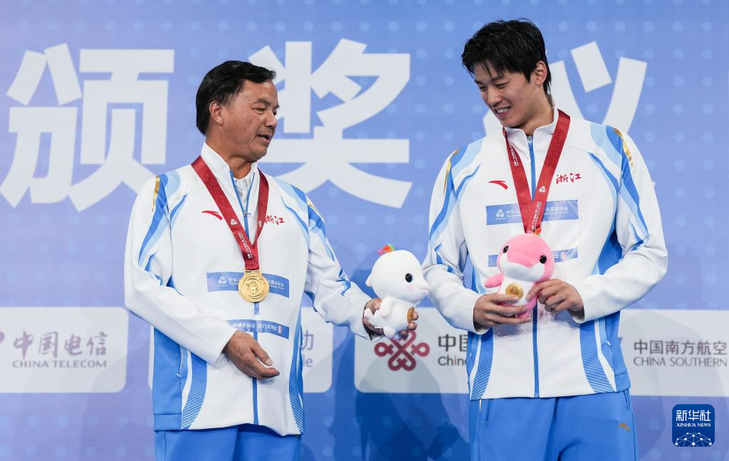11月14日,冠军浙江队选手汪顺(右)和教练朱志根在颁奖仪式上。