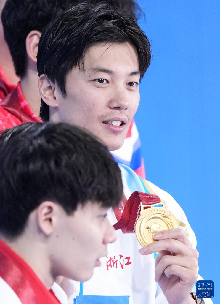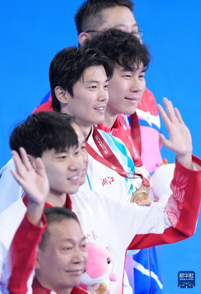 11月14日,冠军浙江队选手汪顺(前三)在颁奖仪式上出场。