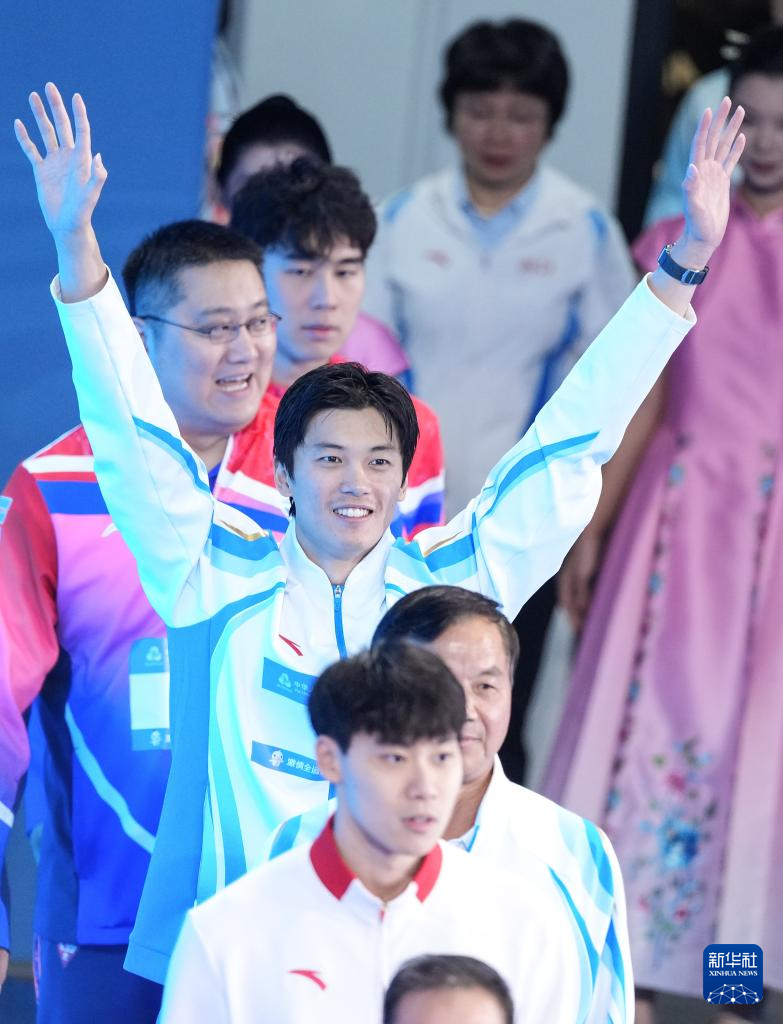 11月14日,冠军浙江队选手汪顺在颁奖仪式后向观众致意。