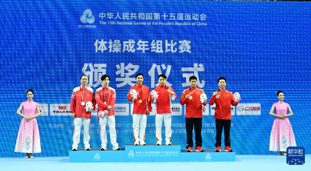 11月14日,亚军湖南队选手张博恒(左三)、冠军四川队选手邹敬园(右四)和季军江苏队选手尤浩(右二)以及教练们在颁奖仪式上。