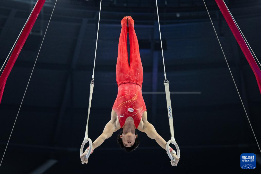 11月14日,湖南队选手张博恒在吊环比赛中。最终,他获得男子鞍马吊环双杠全能决赛亚军。