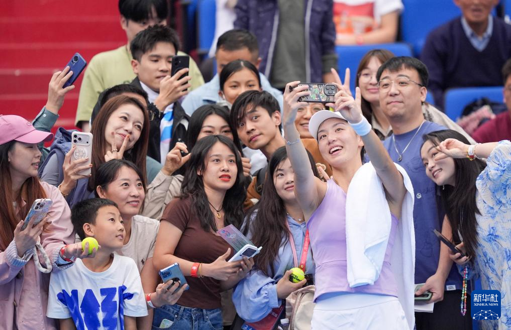11月14日,广东队选手王欣瑜(前)在比赛结束后与观众合影。她2比0战胜福建队选手王育萍,晋级下一轮。