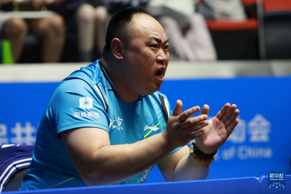 11月14日,北京队选手祝启慧的教练在场边鼓励选手。