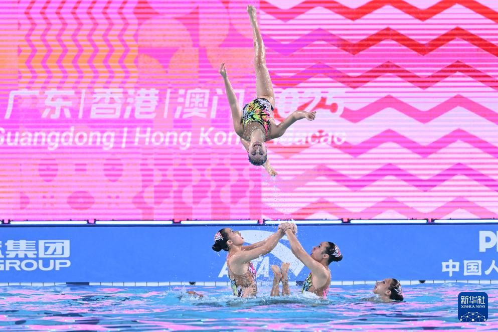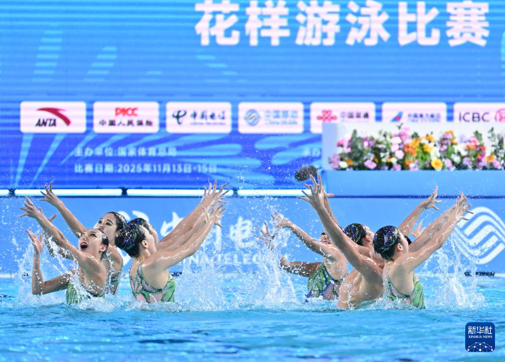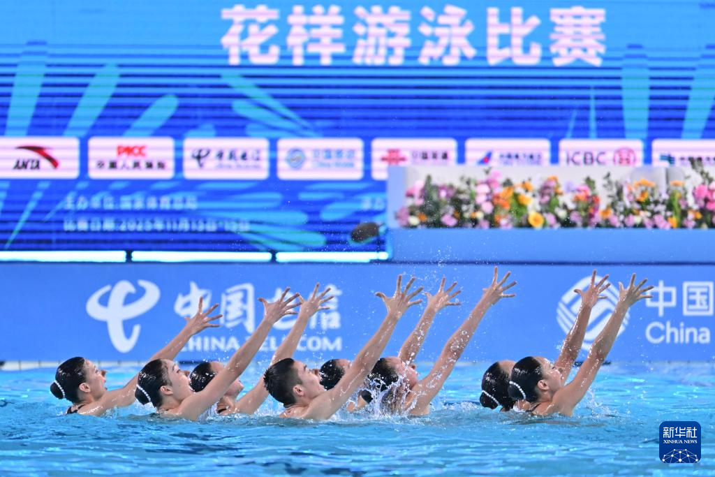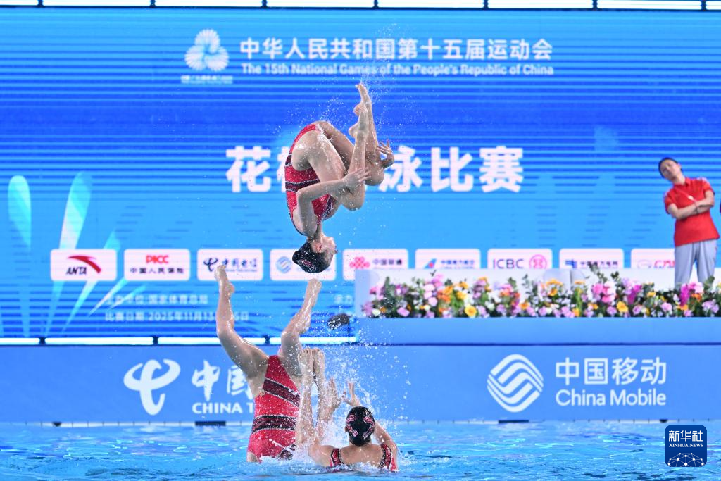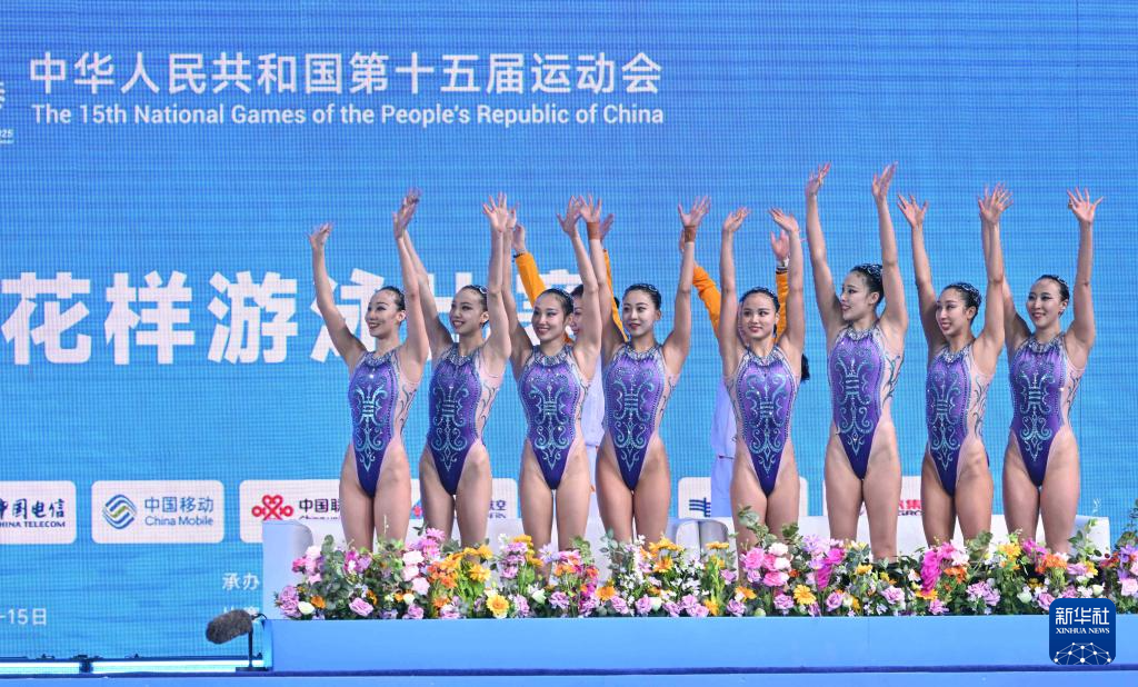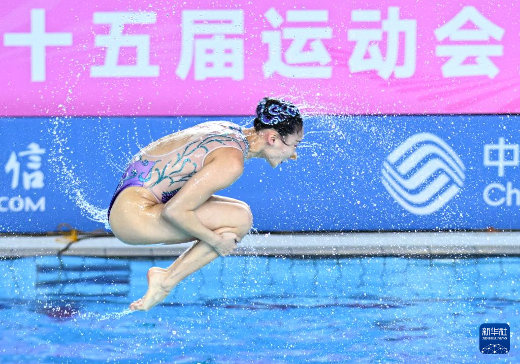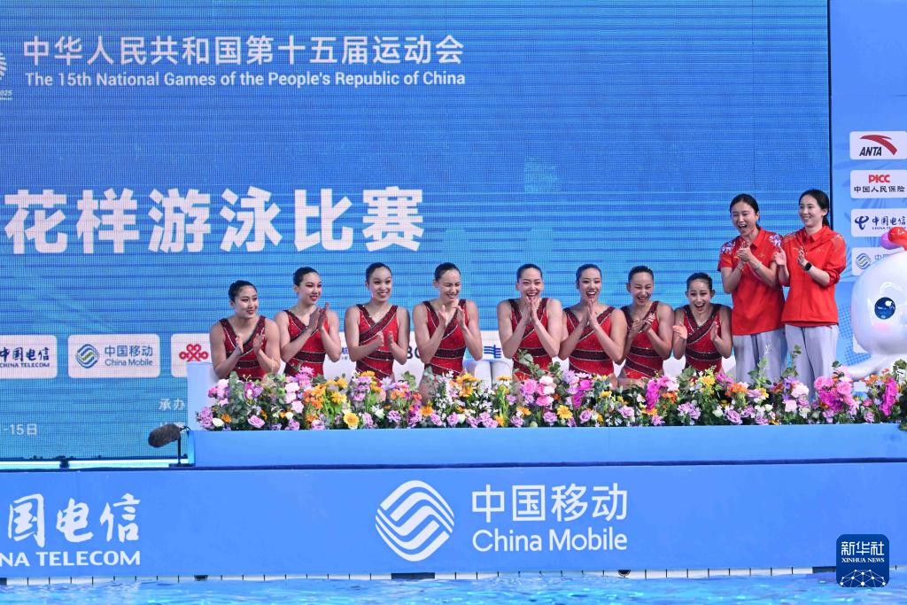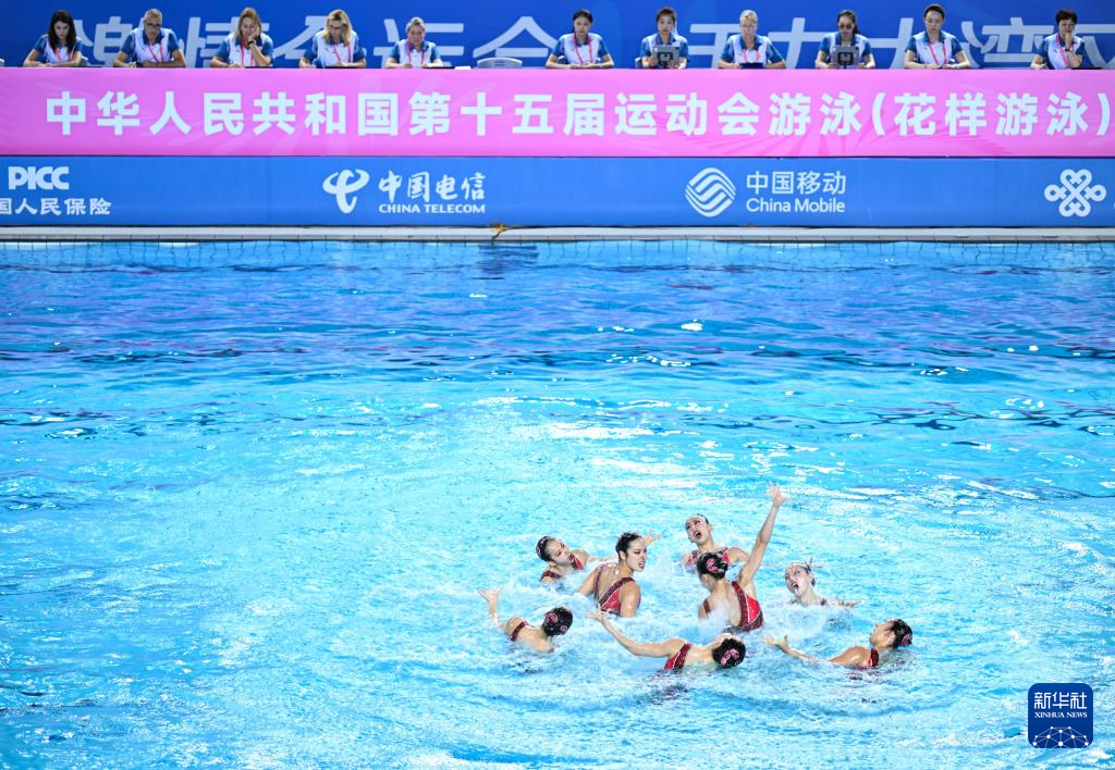 当日,第十五届全国运动会花样游泳项目集体自由自选比赛在广东江门举行。