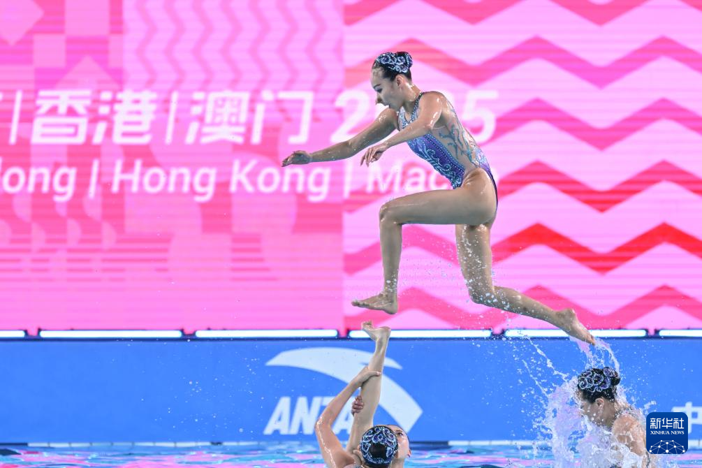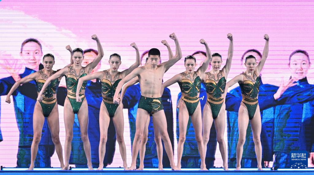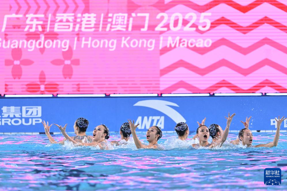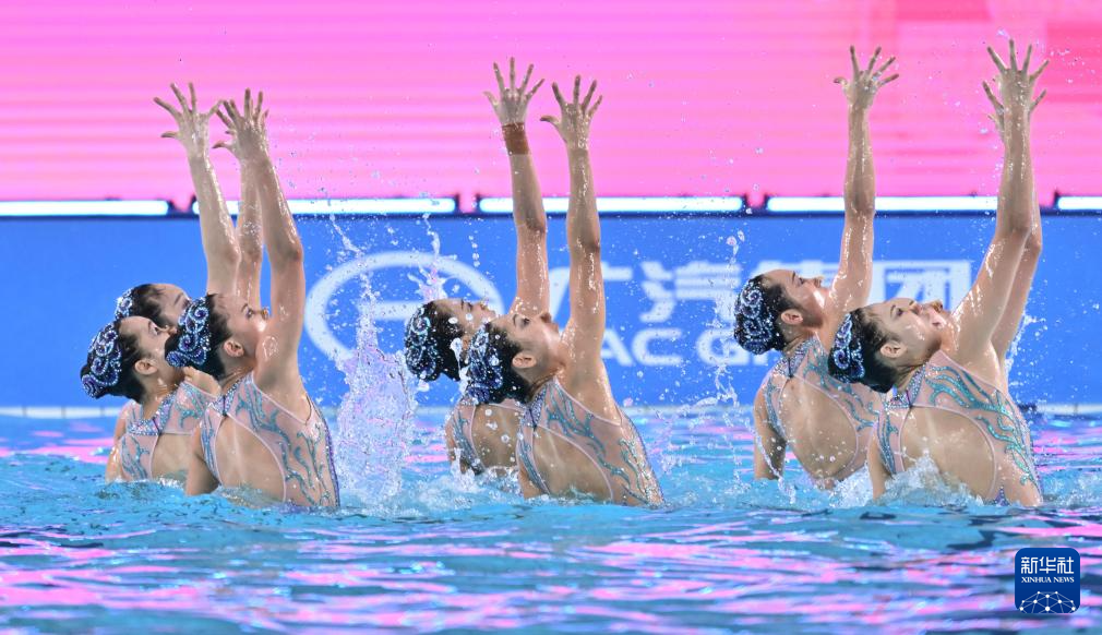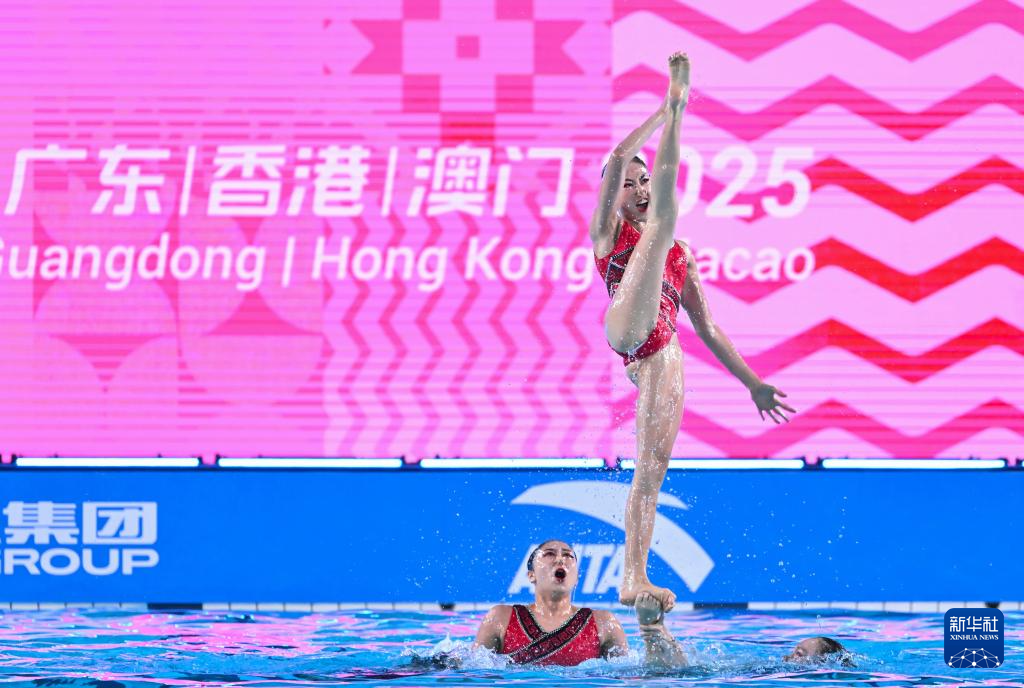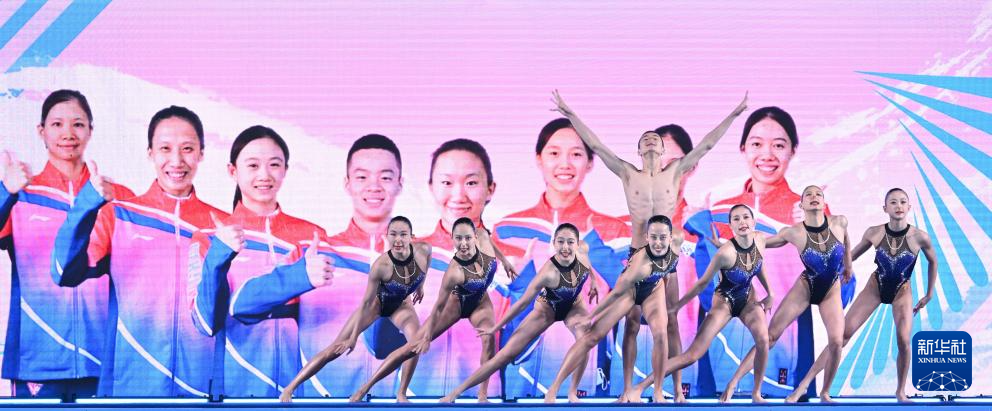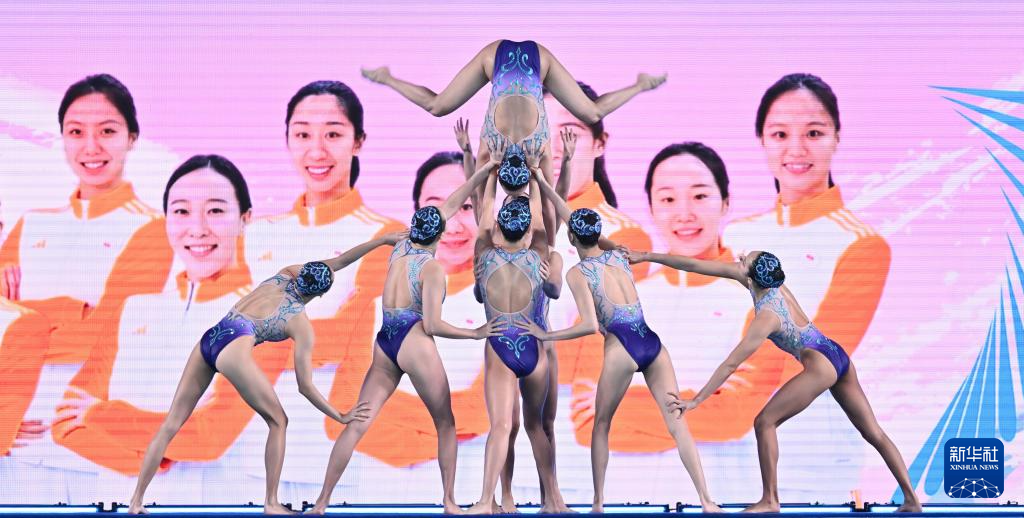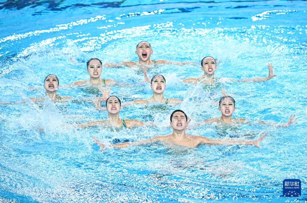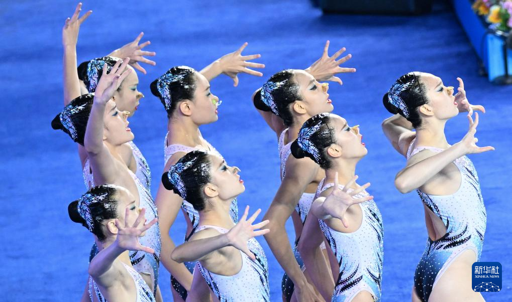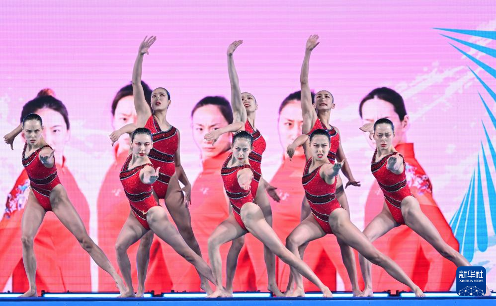 当日,第十五届全国运动会花样游泳项目集体自由自选比赛在广东江门举行。