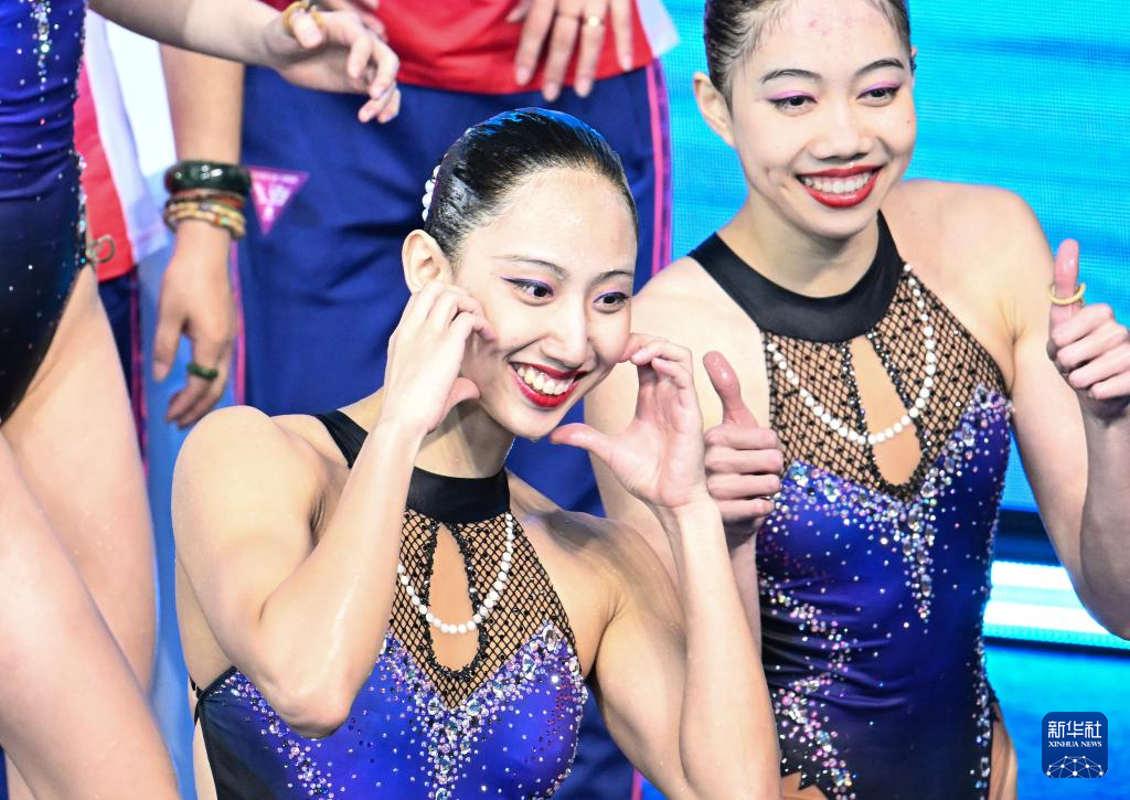 11月13日,上海队队员在赛后“比心”。该队集体自由自选小项成绩位列第五名。