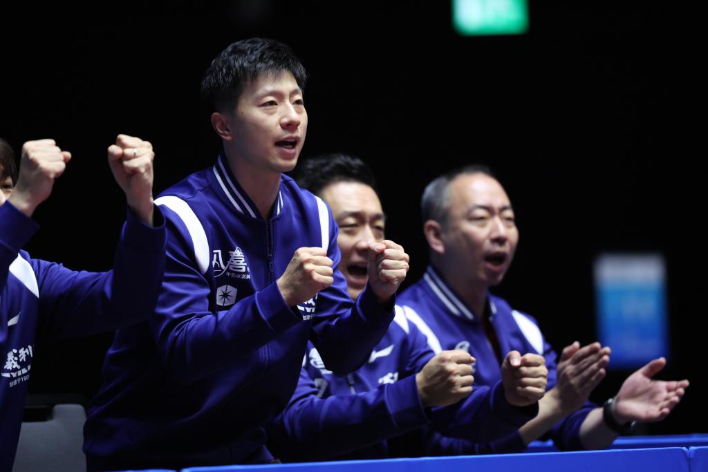 11月14日,北京队选手马龙(左二)在队友王楚钦对阵河南队选手于何一的男单比赛场边庆祝。新华社记者 刘续 摄
