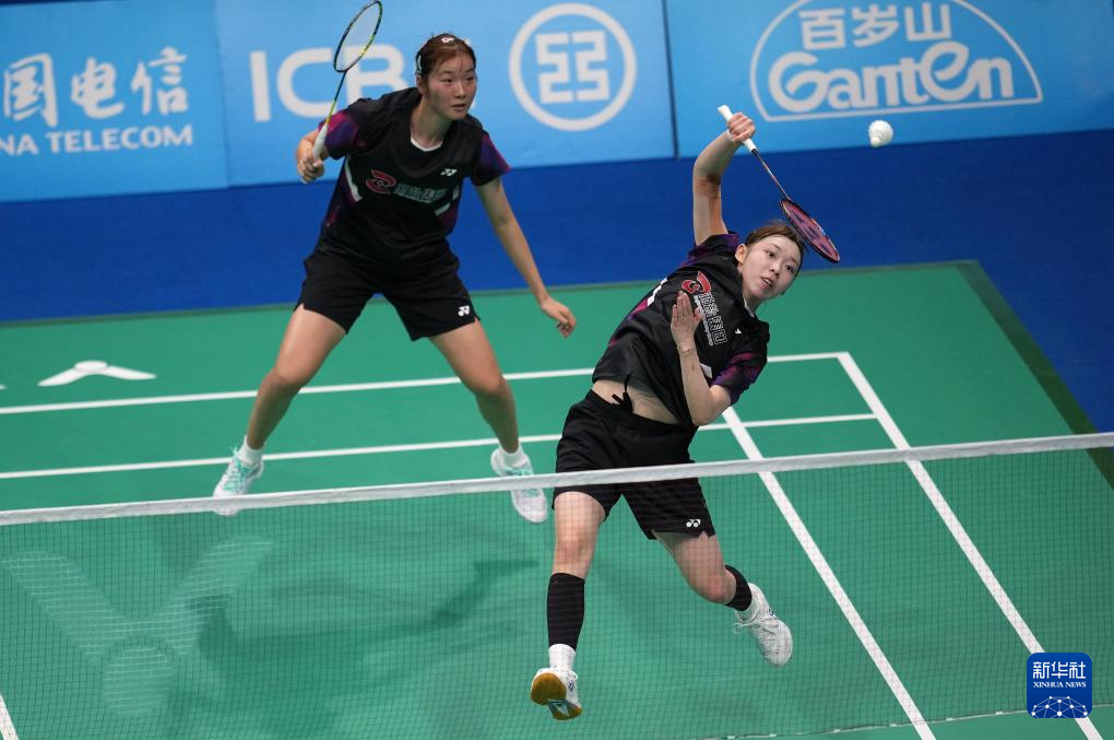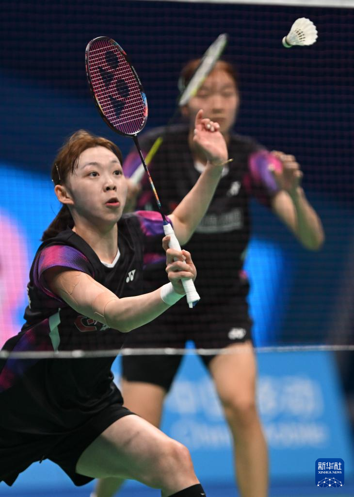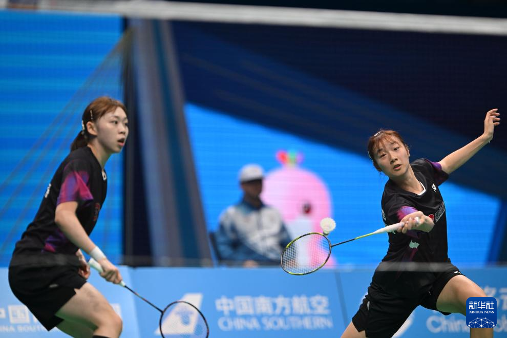 11月14日,浙江队组合陈樊淑湉/吴梦莹(左)在女双比赛中回球。她们2比0战胜江苏队组合何冰娇/鲍骊婧。