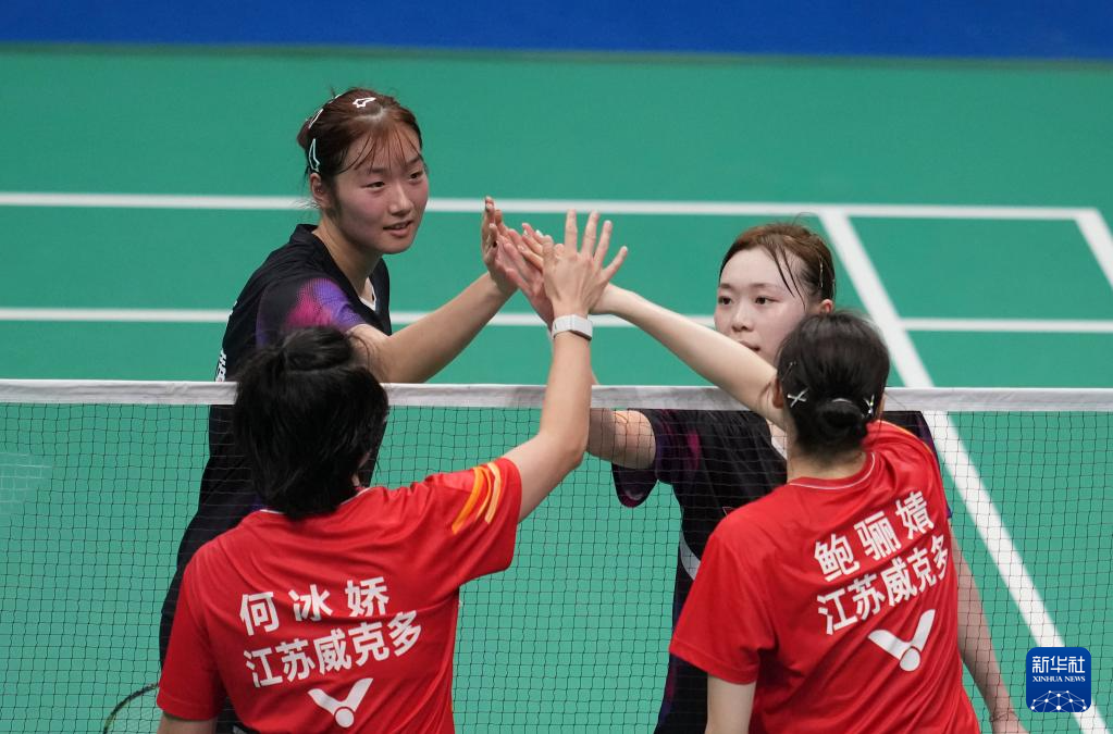 11月14日,浙江队组合陈樊淑湉(后左)/吴梦莹(后右)在女双比赛中和江苏队组合何冰娇/鲍骊婧击掌致意。最终,浙江队组合陈樊淑湉/吴梦莹2比0战胜江苏队组合何冰娇/鲍骊婧。