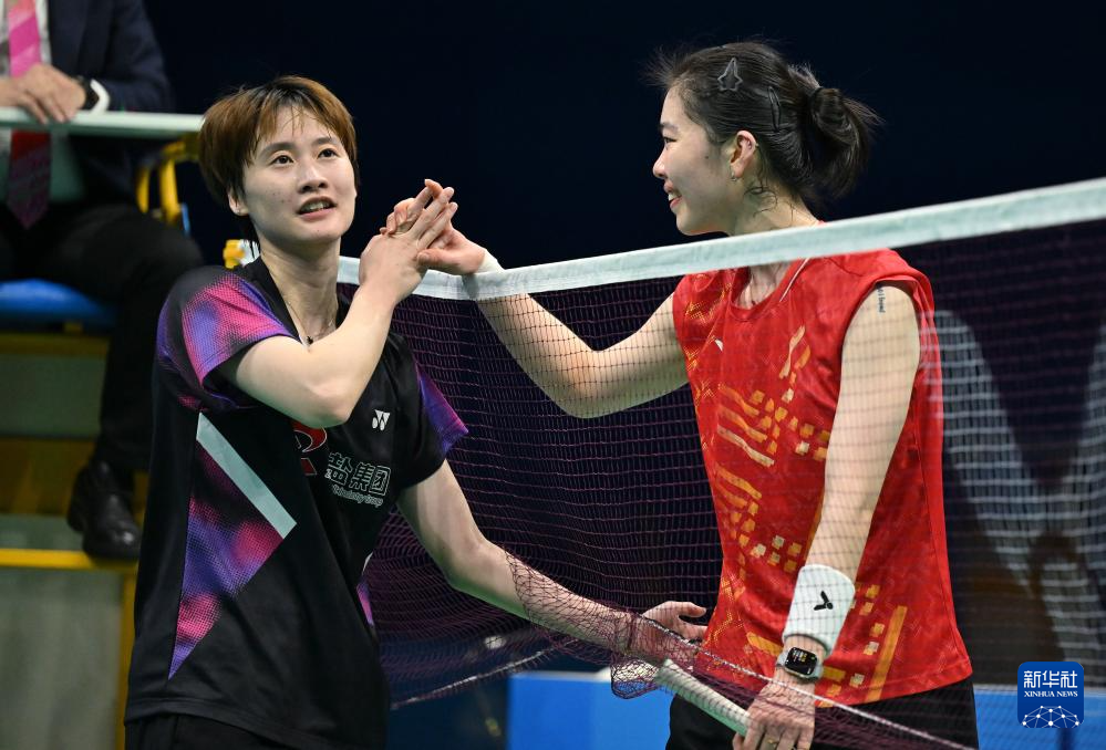 11月14日,江苏队选手高昉洁(右)在比赛后向浙江队选手陈雨菲表示祝贺。她0比2不敌陈雨菲。