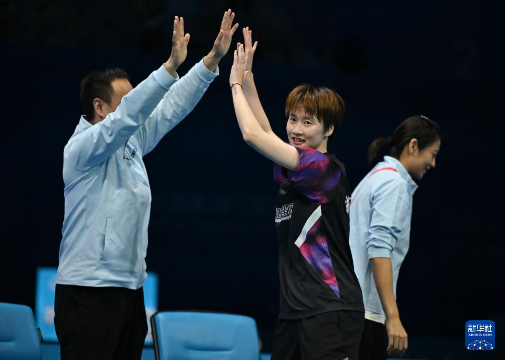 11月14日,浙江队选手陈雨菲(中)在获胜后与教练庆祝。她2比0战胜江苏队选手高昉洁。