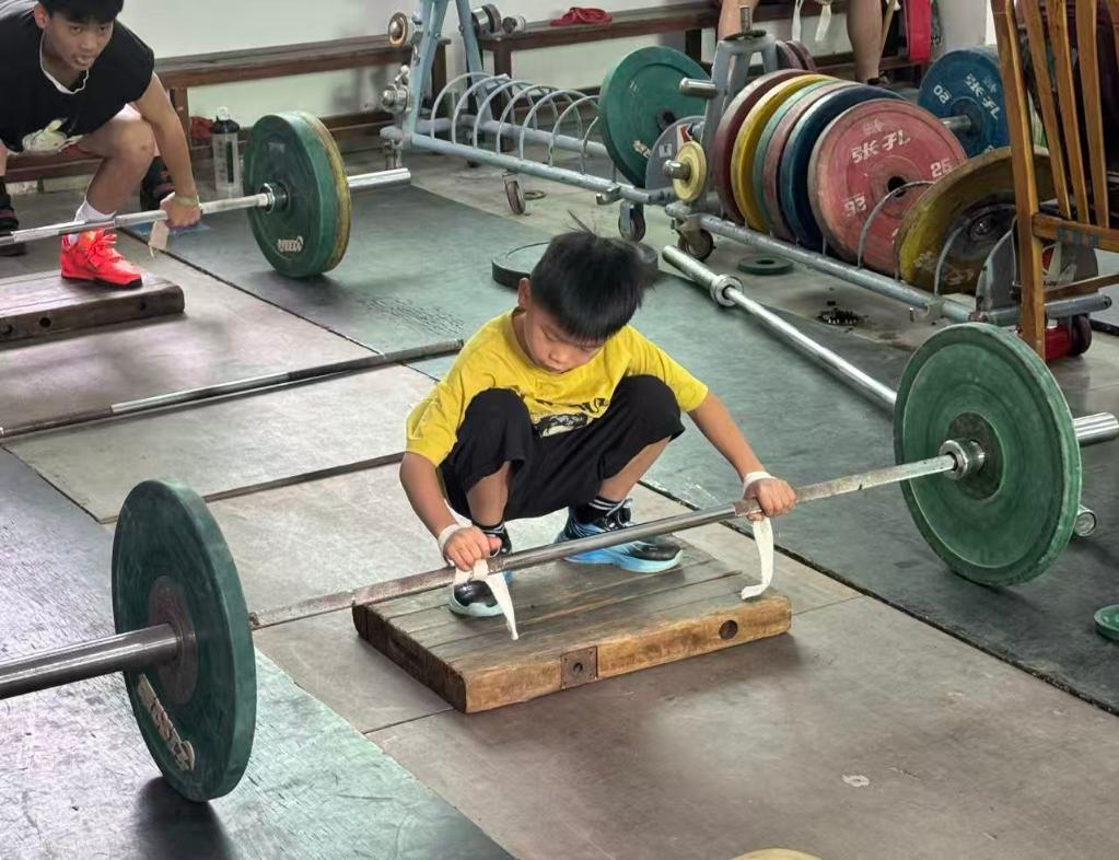 10岁的徐鑫骏,好像就有何教练曾经的影子。同样来自湖南的他,是体校里年龄最小的学员之一。体重只有23公斤的他,接受采访时坐在凳子上脚都够不到地面,硬拉却可以达到两倍体重。