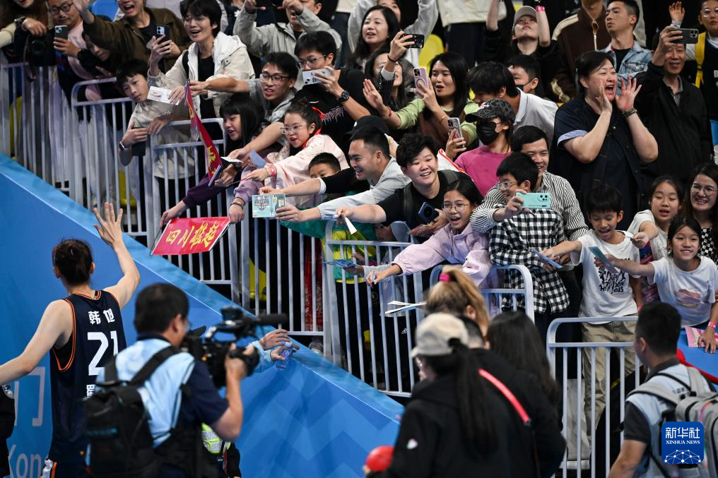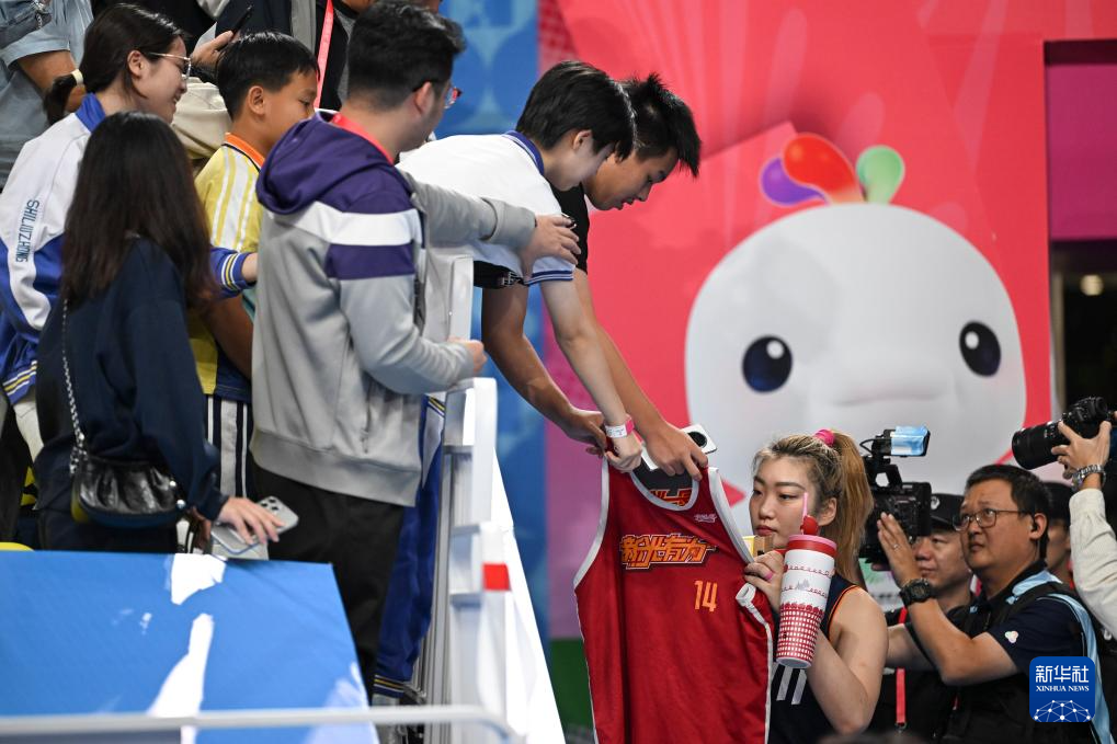 11月14日,四川队球员李梦在赛后与球迷互动。
