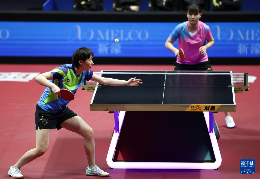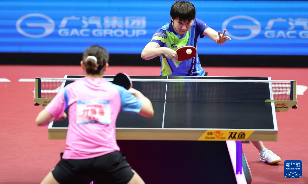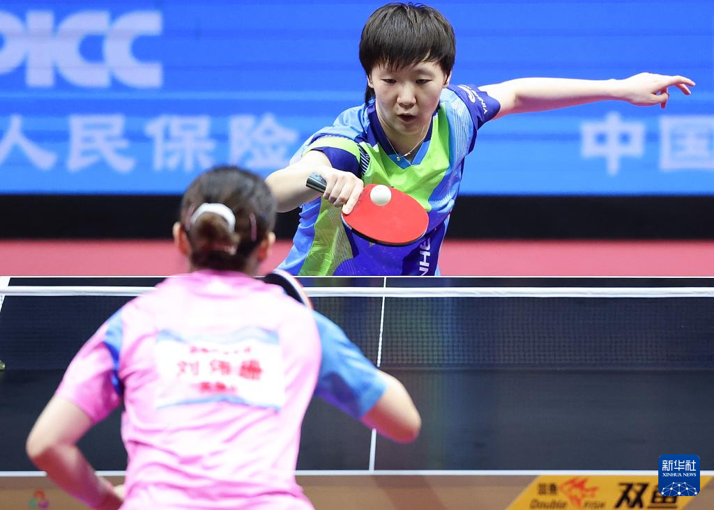 11月14日,黑龙江队选手王曼昱(上)在女单比赛中回球。她3比0战胜天津队选手刘炜珊。