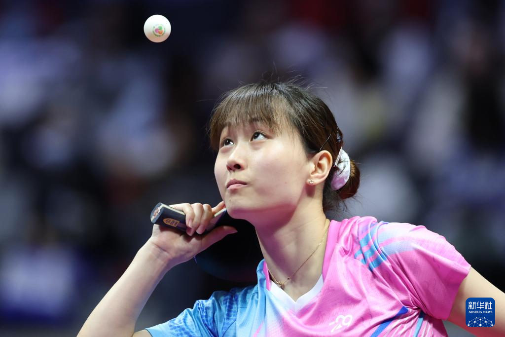 11月14日,黑龙江队选手王曼昱在女单比赛中发球。她3比0战胜天津队选手周倩婷。