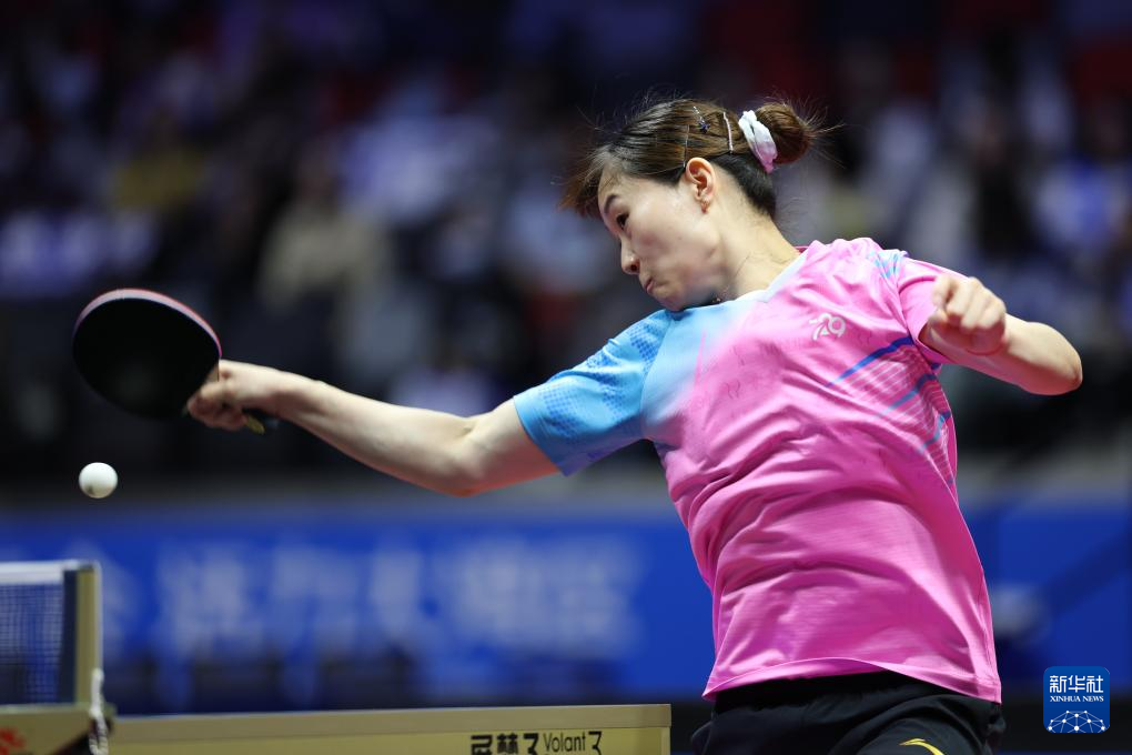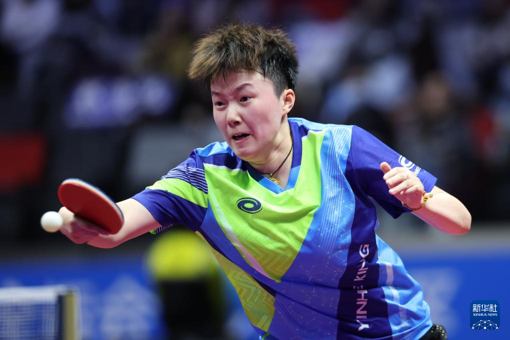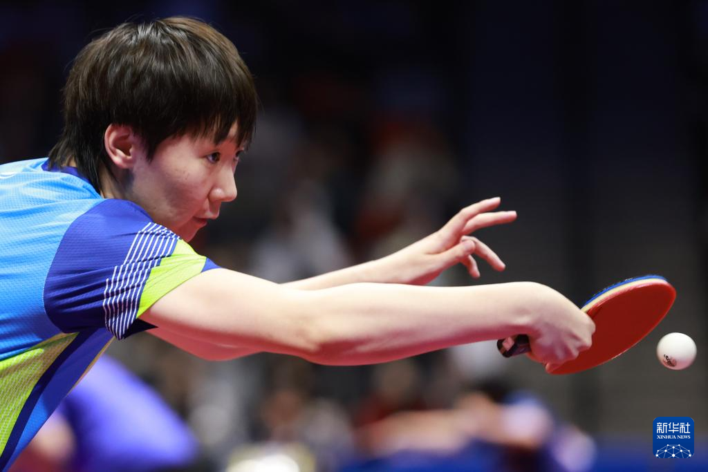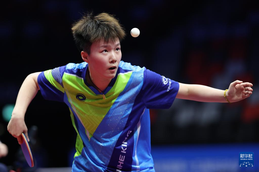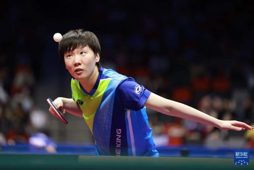 11月14日,黑龙江队选手王曼昱在女单比赛中回球。她3比0战胜天津队选手周倩婷。