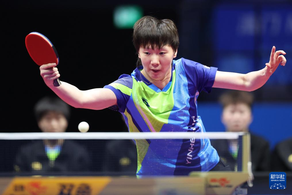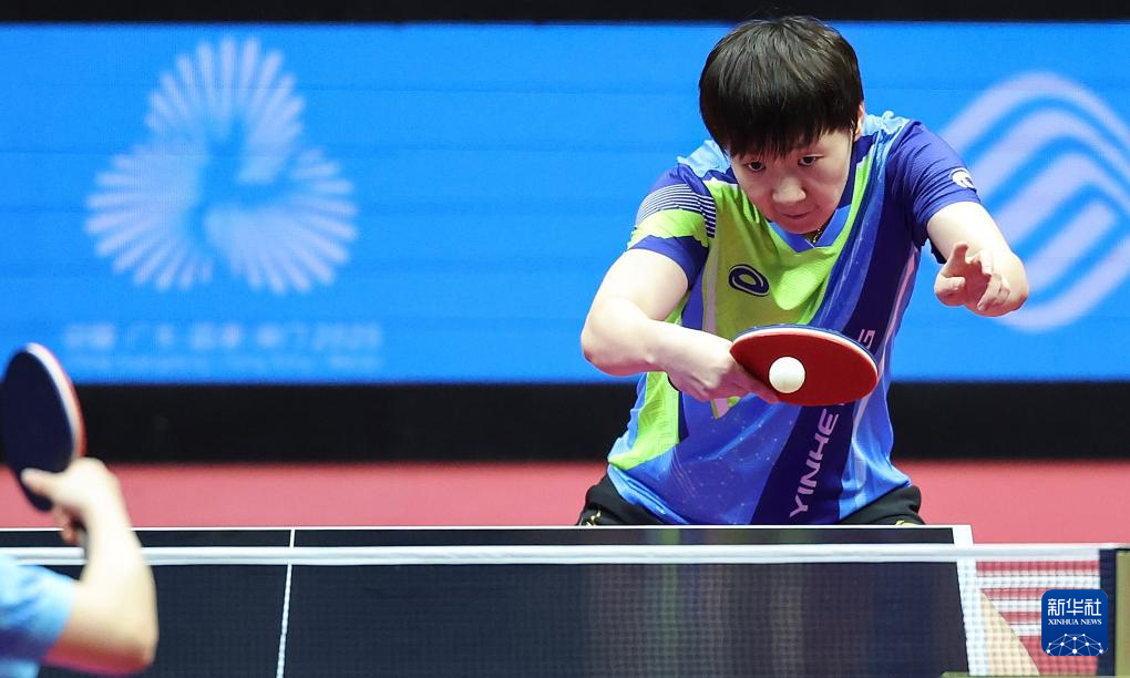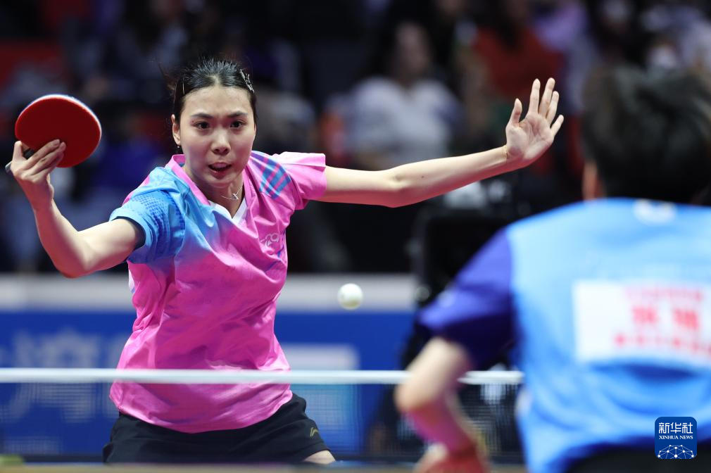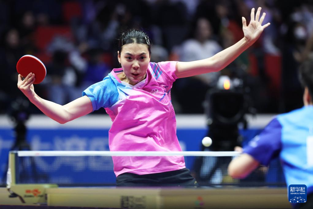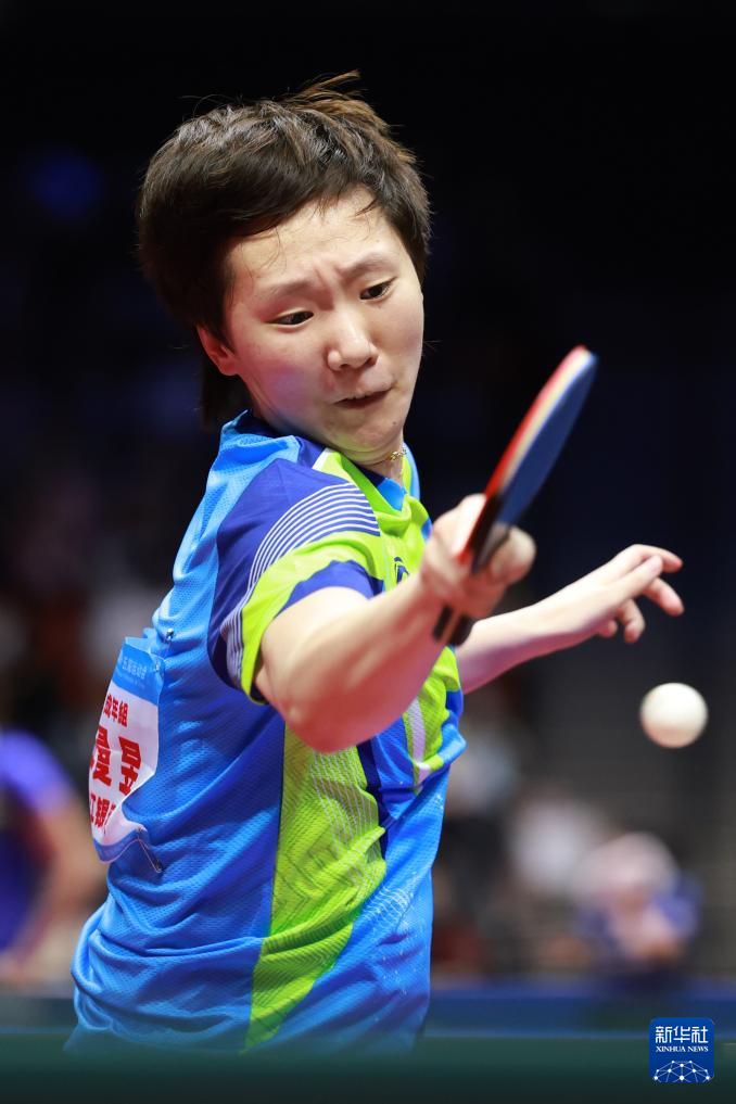 11月14日,黑龙江队选手王曼昱在女单比赛中回球。她3比0战胜天津队选手周倩婷。
