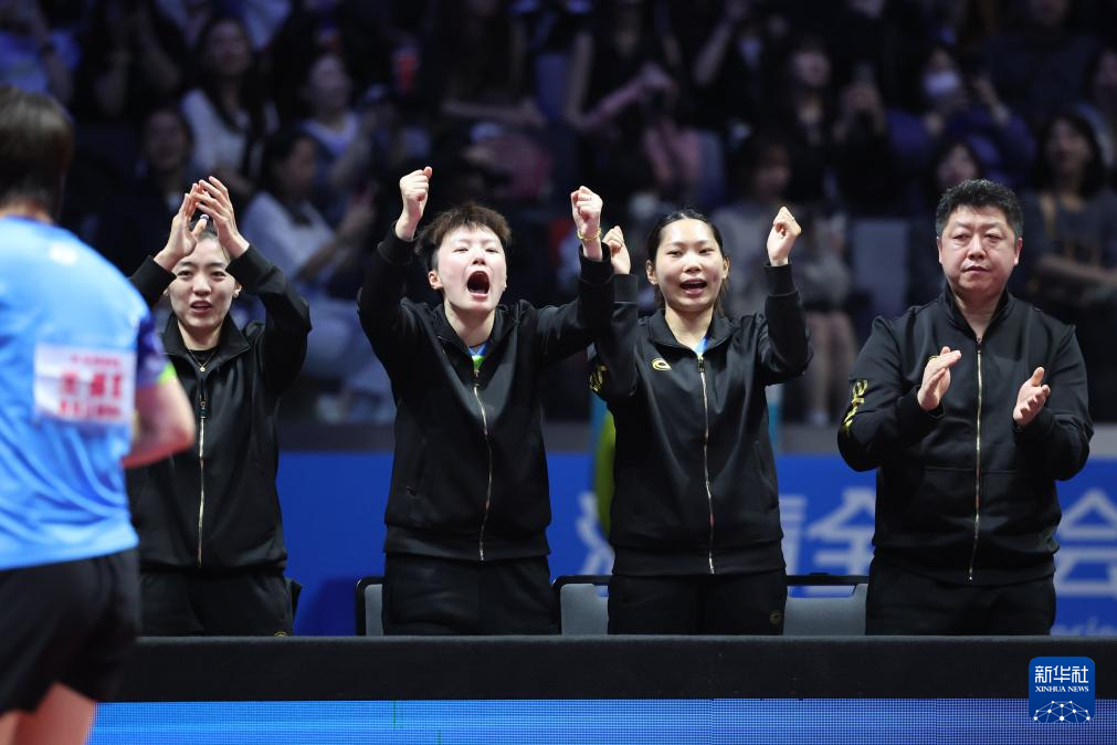 11月14日,黑龙江队选手和教练在王曼昱对阵天津队选手刘炜珊的女单比赛场边庆祝。王曼昱3比0战胜刘炜珊。
