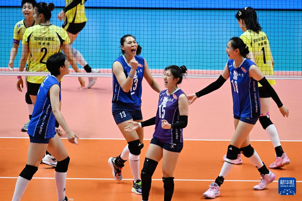 11月14日,北京队球员在比赛中庆祝得分。