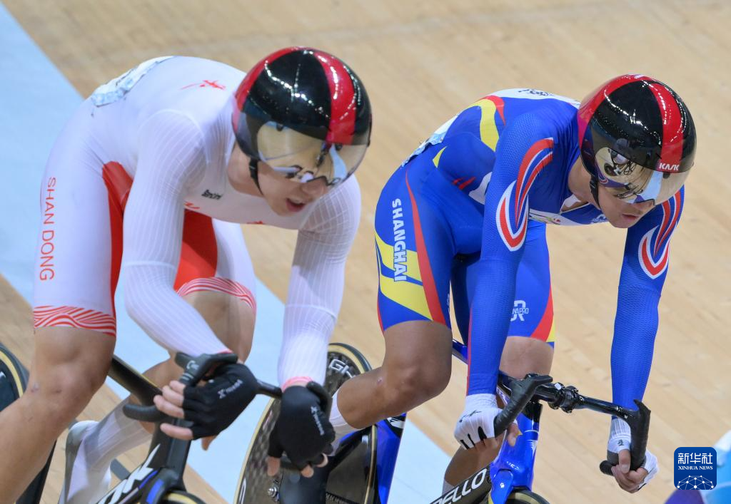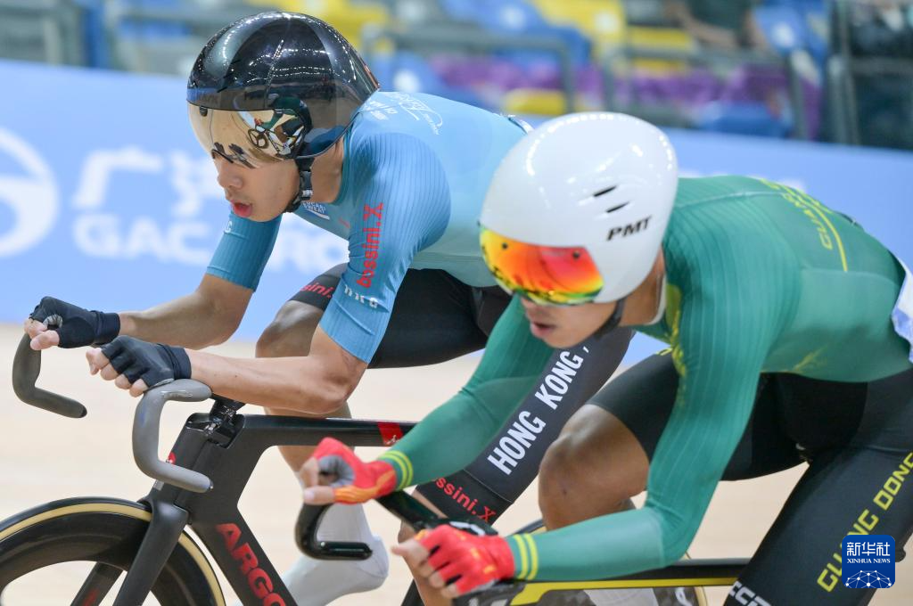 11月15日,香港队选手曹棨光(左)、广东队选手马彬焱在男子全能赛的冲刺赛中。