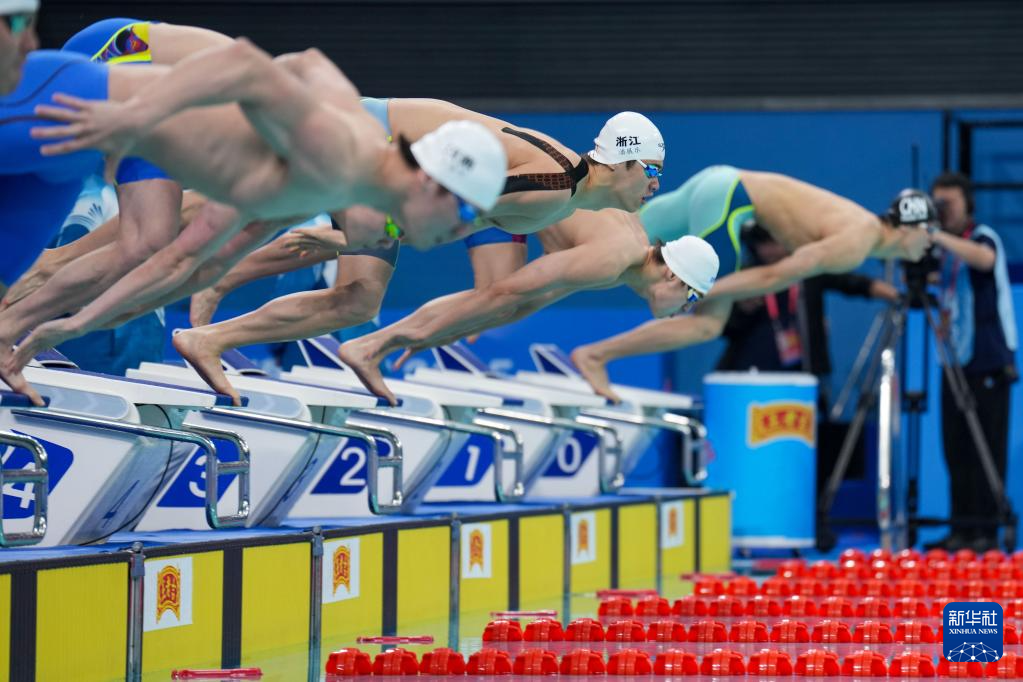 11月15日,浙江队选手潘展乐(右三)在男子50米自由泳预赛中出发。他晋级半决赛。