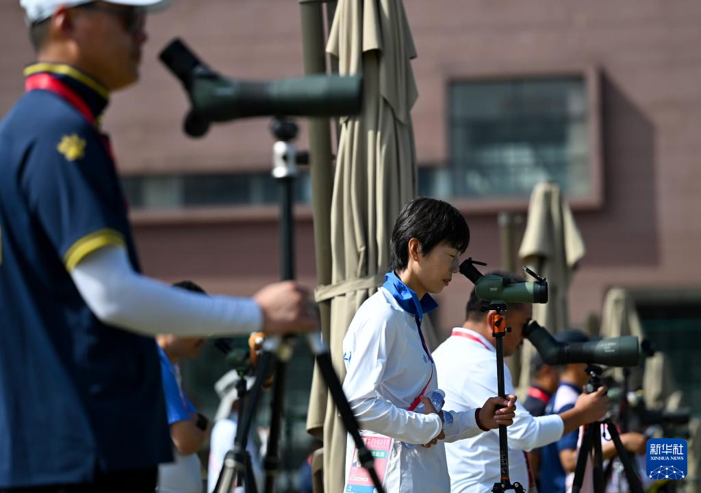 11月15日,青海队教练赵琳丽(左二)在比赛中通过望远镜查看选手成绩。