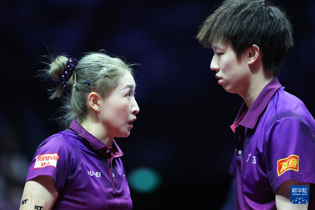 11月14日,广东队组合林高远(左)/刘诗雯在比赛中交流。