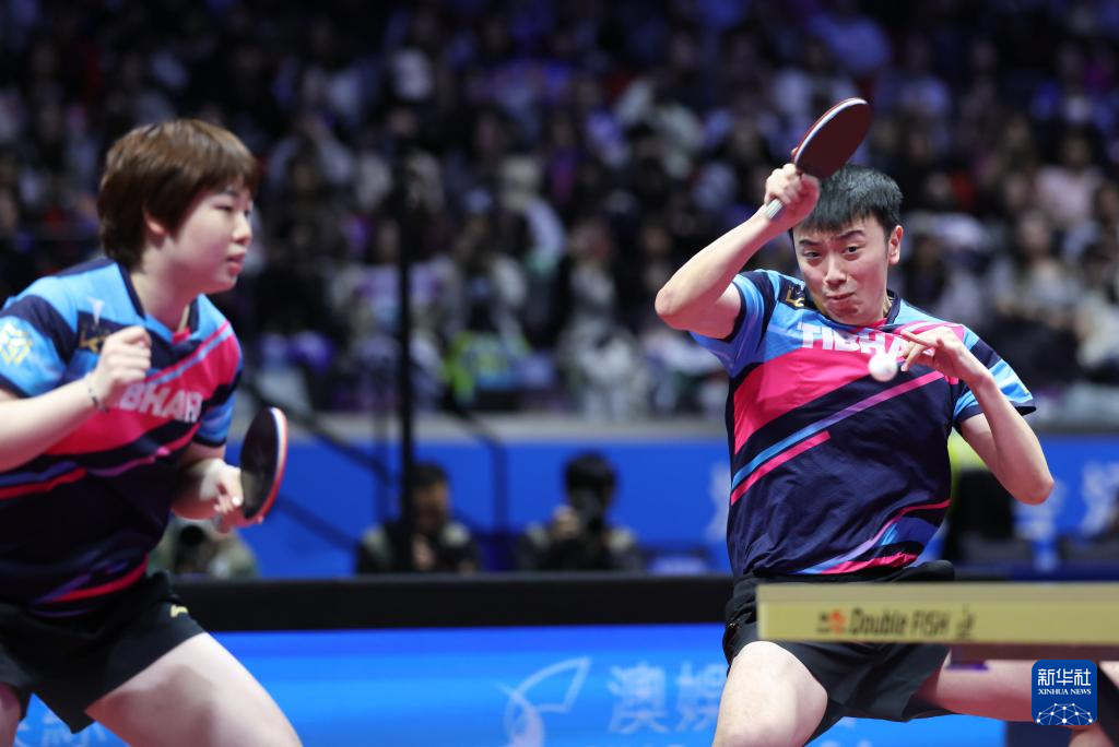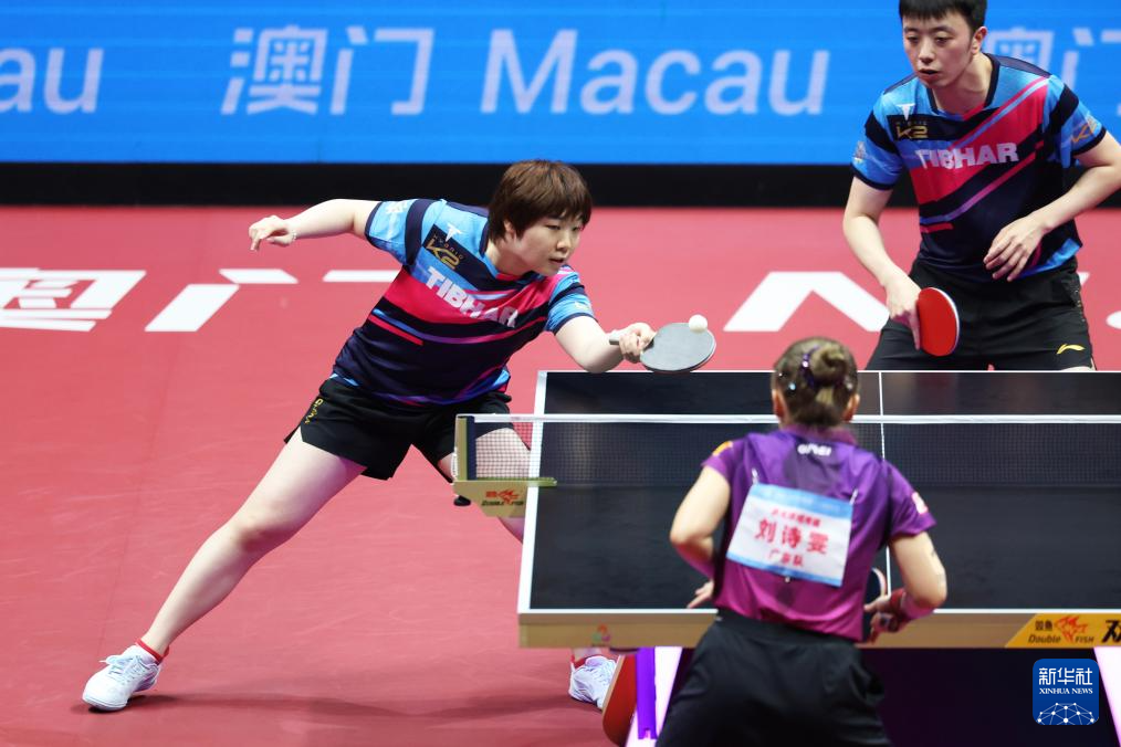 11月14日,广东队组合林高远(左)/刘诗雯在比赛中回球。