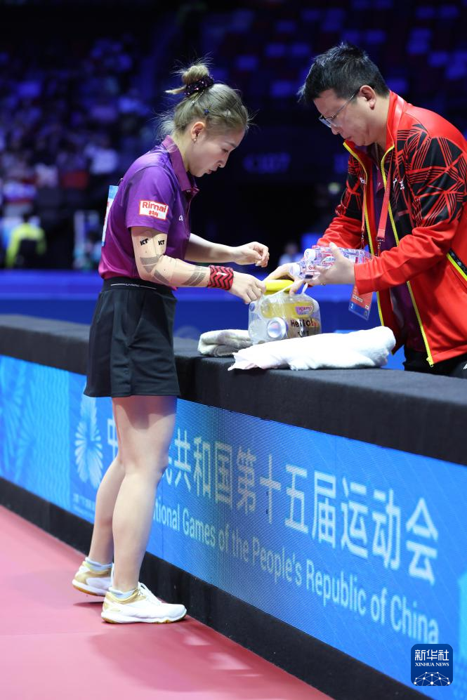 11月14日,广东队选手刘诗雯(左)进行赛前准备。