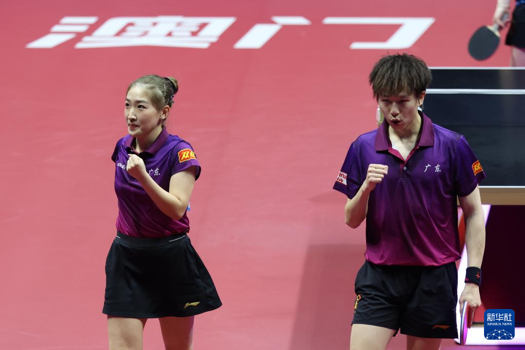 11月14日,广东队组合林高远/刘诗雯(左)在比赛中庆祝得分。