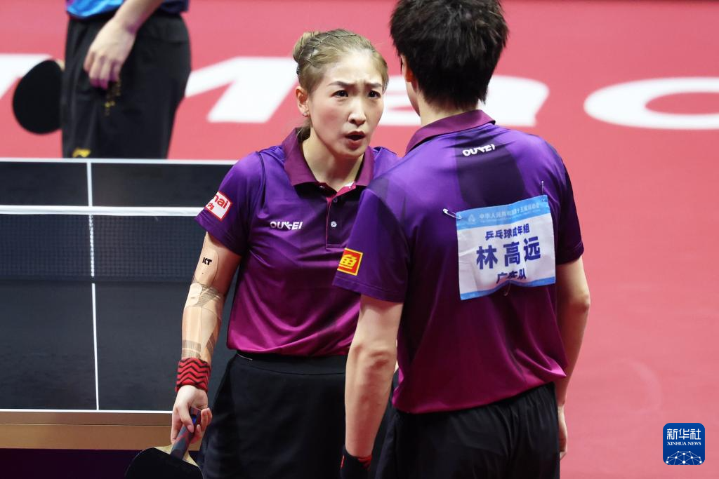 11月14日,广东队组合林高远/刘诗雯(左)在比赛中交流。