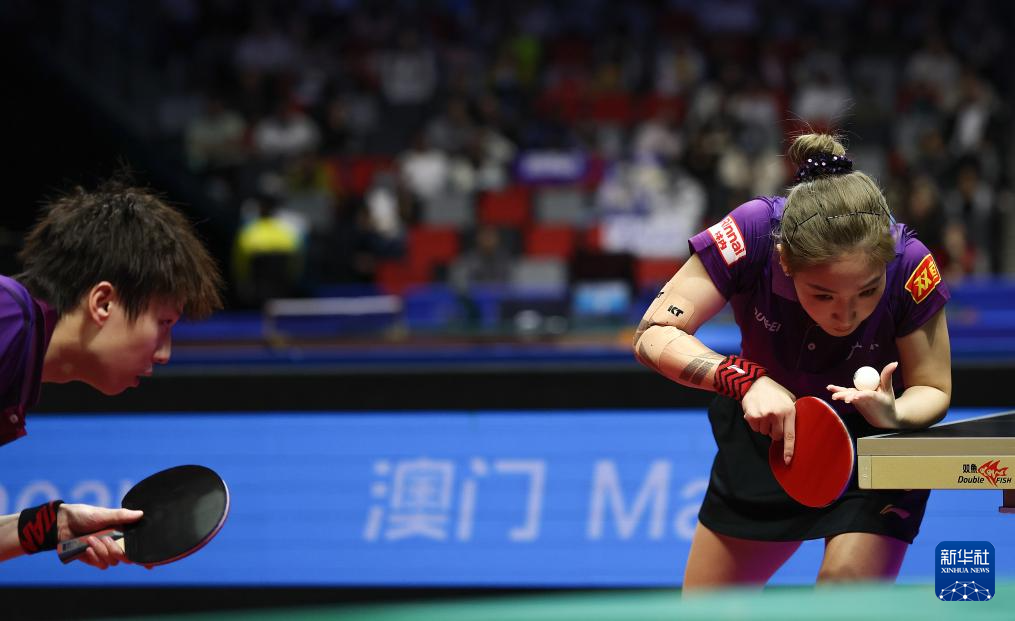 11月14日,广东队组合林高远(右)/刘诗雯在比赛中回球。