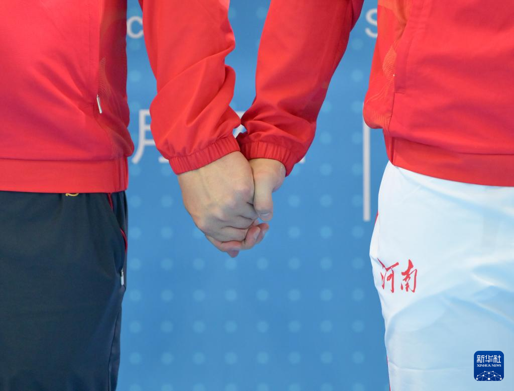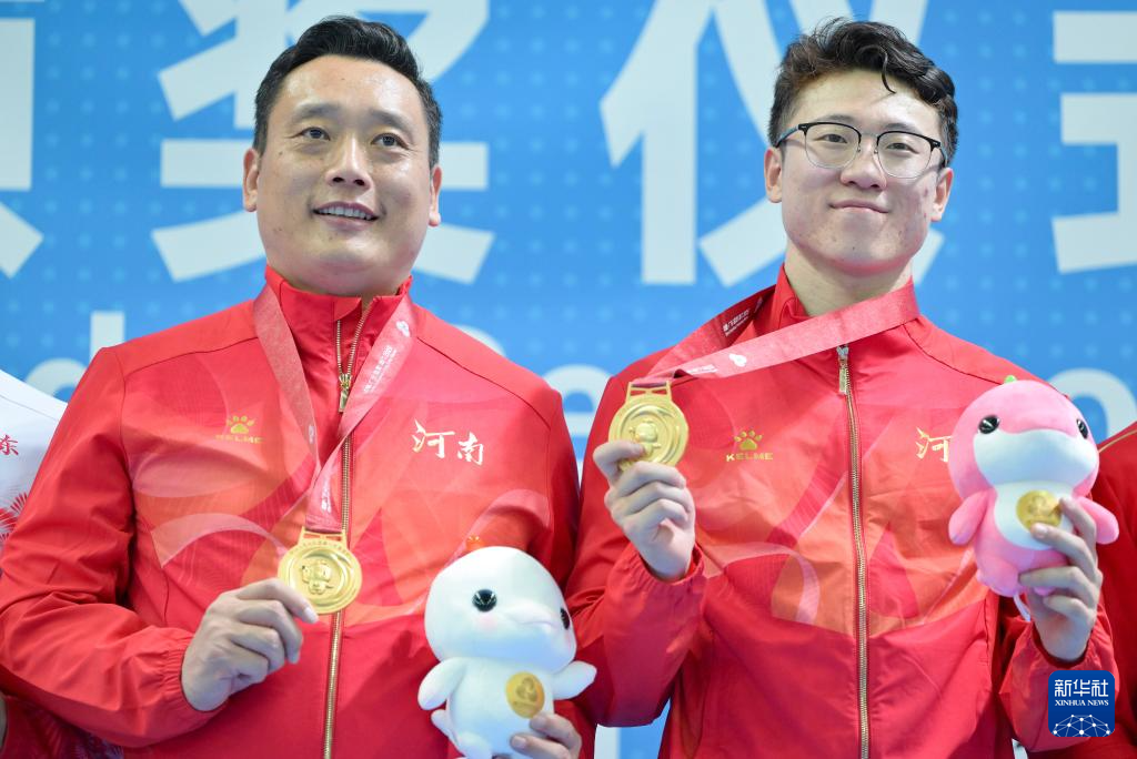 11月15日,冠军河南队选手刘琦(右)和教练在颁奖仪式上。