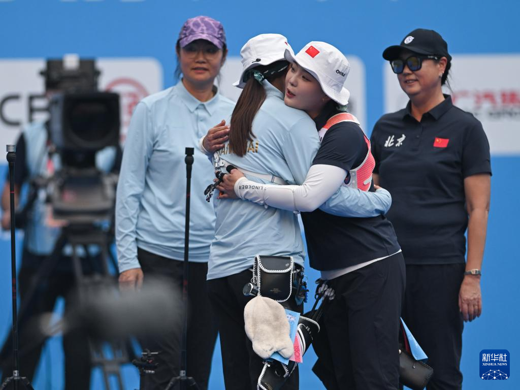 11月16日,在女子反曲弓个人决赛铜牌赛后,北京队选手李佳蔓(右二)与上海队选手朱静怡(左二)拥抱。李佳蔓6比2战胜朱静怡,获得季军。