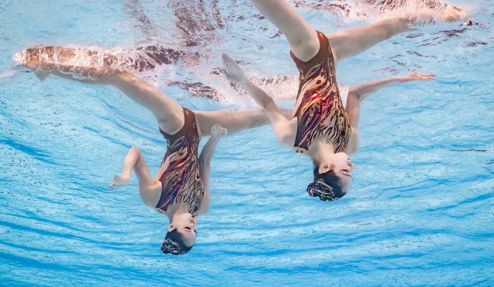 2024年8月10日,巴黎奥运会花样游泳双人自由自选在巴黎奥林匹克水上运动中心举行,中国组合王柳懿/王芊懿在比赛中。新华社记者 夏一方 摄