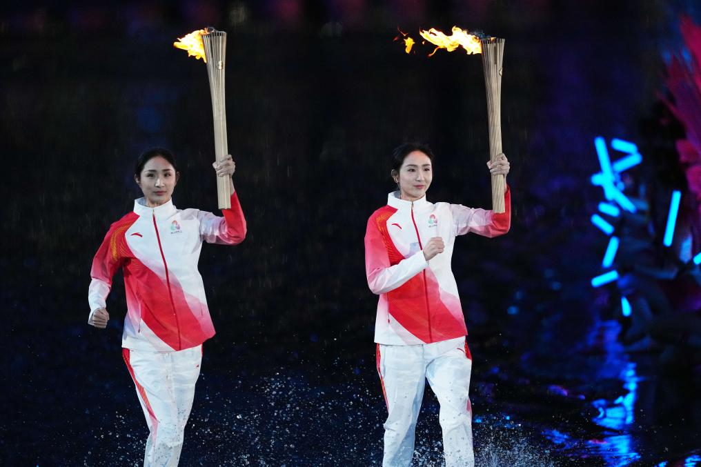 11月9日,第十五届全国运动会开幕式在广东奥林匹克体育中心举行。火炬手王柳懿、王芊懿传递火炬。新华社记者 李一博 摄