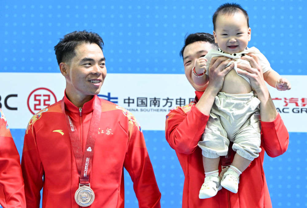 领奖台上,带伤出战的江苏老将郭亮举起了自己九个月大的儿子,赢得现场一片掌声和祝福。