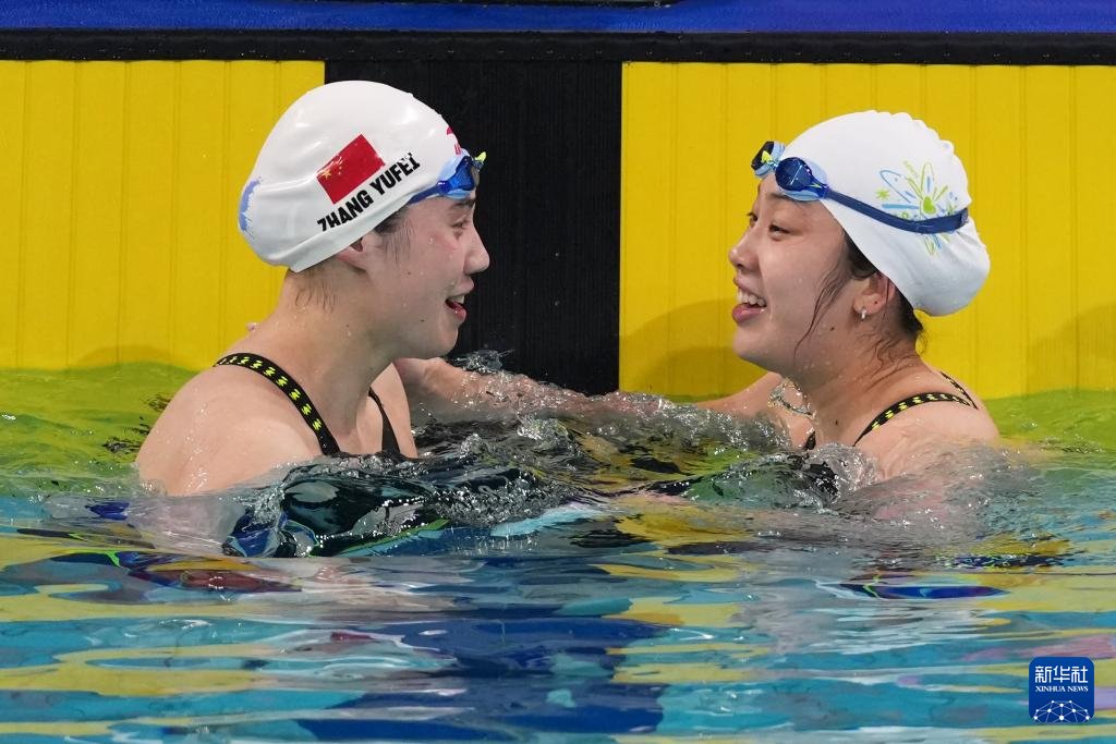 11月16日,获得冠军的江苏队选手张雨霏(左)在比赛后与获得亚军的浙江队选手吴卿风交流。