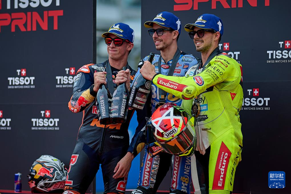 11月15日,获得冲刺赛第一名的BK8格雷西尼车队西班牙车手亚历克斯·马克斯(中)、第二名红牛KTM工厂车队西班牙车手佩德罗·阿科斯塔(左)和第三名VR46车队意大利车手法比奥·迪·詹南托尼奥在颁奖仪式上合影。
