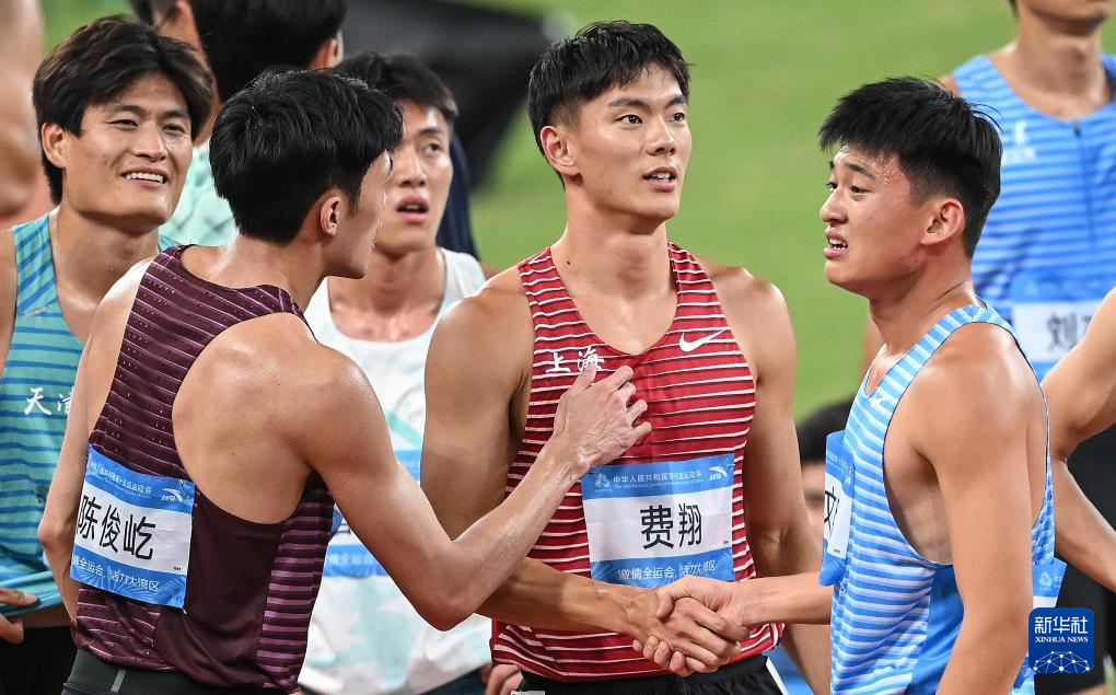 11月16日,山东队选手张文熙(右一)和上海队选手费翔(右二)在比赛后。最终,他们分别获得男子十项全能亚军和季军。