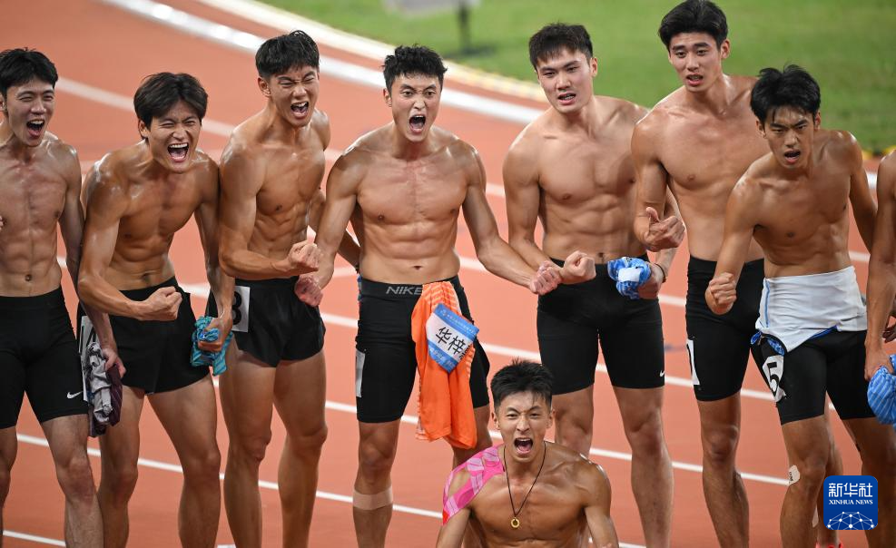 11月16日,浙江队选手华梓惠(左四)和其他选手在比赛后合影。最终,他获得男子十项全能冠军。