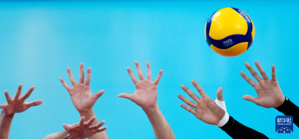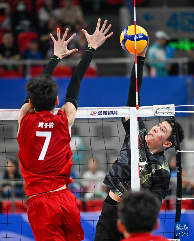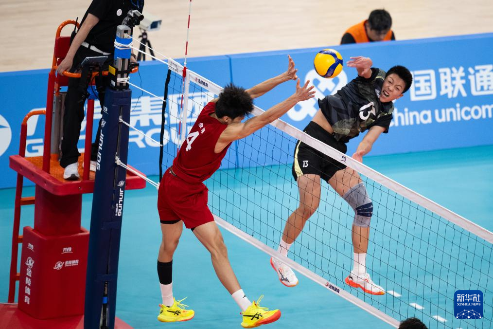 11月16日,浙江队球员张陈镭(左)、余翔(右)在比赛中拦网。