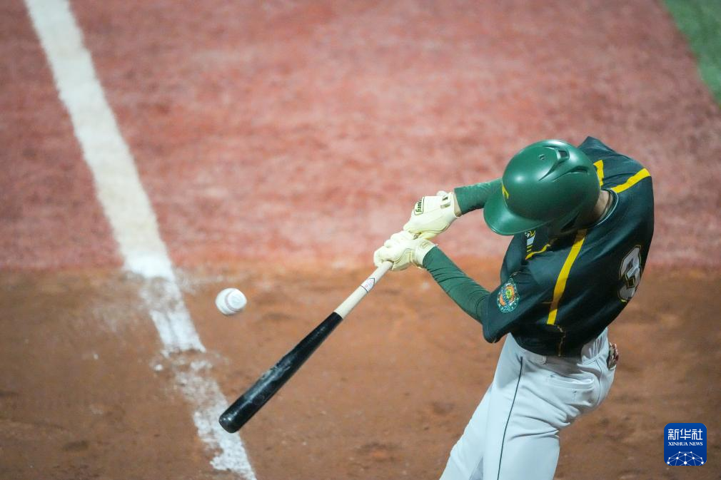 11月16日,天津队球员倪鑫泽在比赛中击球。