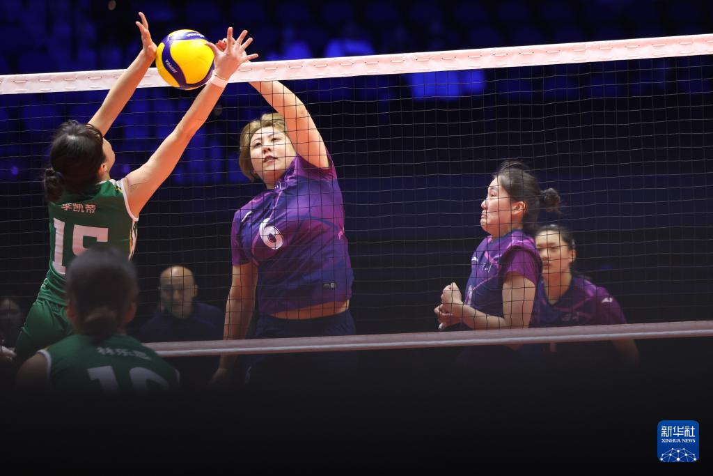 11月15日,四川队球员王晨(左二)、王思佳(左三)和袁果(右一)在比赛中拦网。