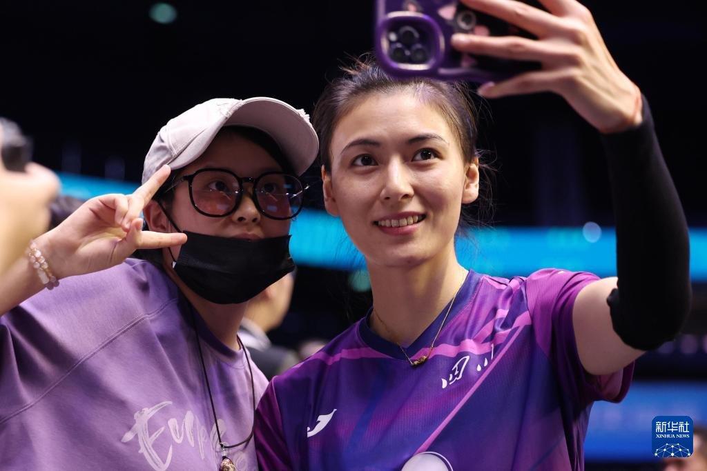 11月15日,四川队球员缪伊雯(右一)在赛后和球迷自拍合影。