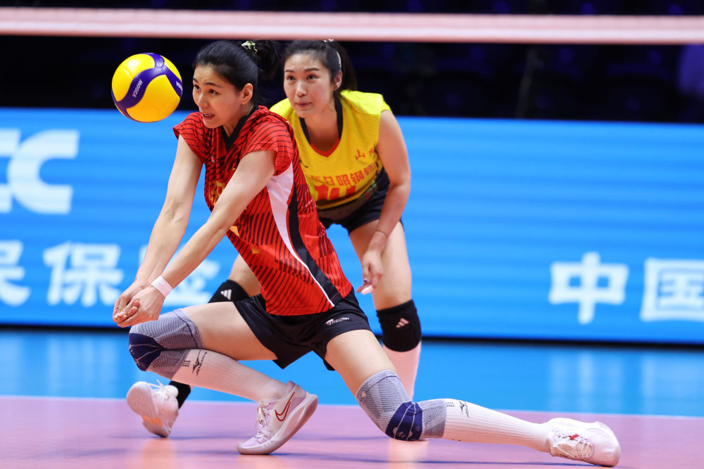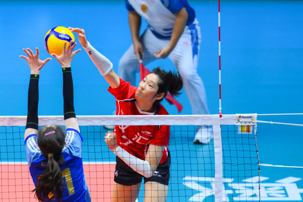 11月17日,山东队球员杜清清(左)在比赛中接球。新华社记者 陈斌 摄