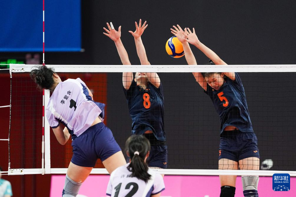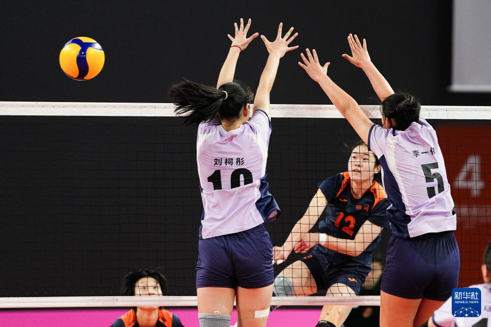 11月17日,四川队球员王雪霏(上中)、柳妍如(上右)在比赛中拦网。