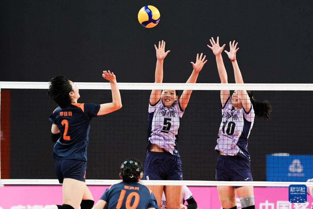 11月17日,河南队球员刘柯彤(上右)、李一依(上中)在比赛中拦网。